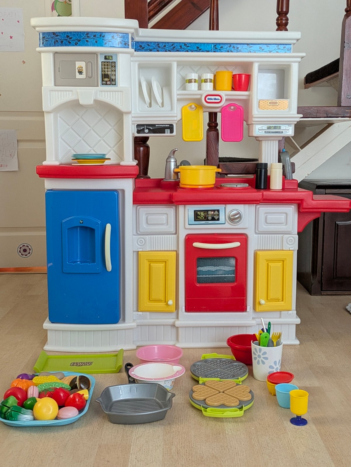 Predám kuchynku s kuchynským príslušenstvom, so zeleninou a ovocím na krájanie, waflovačkom a doplnkami v peknom neporušenom stave. Variaca doska po zapnutí vydáva zvuky. Výška 104,5 cm, šírka 102 cm.Ideálne osobný odber v Bratislave.