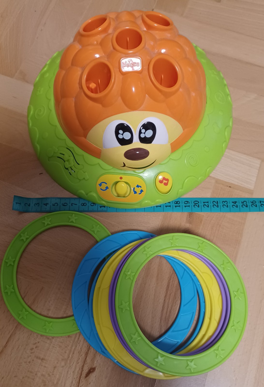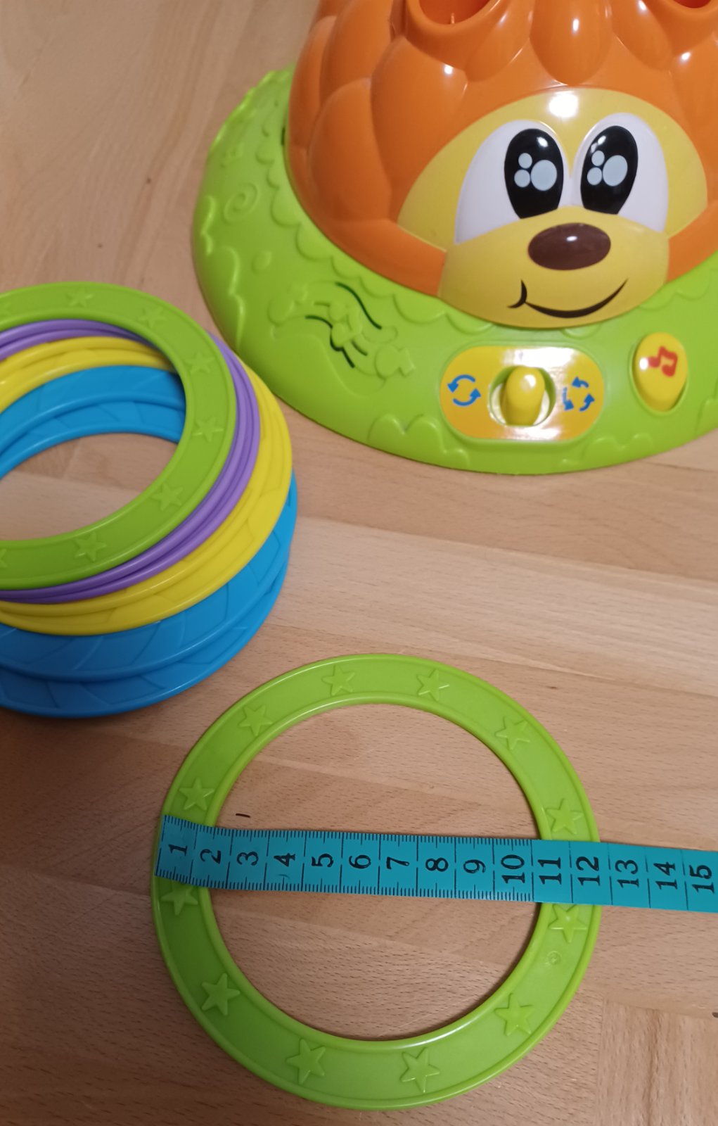 Pestrofarebná hudobná hračka, ktorá rozpohybuje všetky deti. Úlohou dieťaťa je umiestniť 8 farebných krúžkov na základňu, ktorá sa pohybuje dvoma rôznymi rýchlosťami. Na výber má pri tejto zábave dieťatko z 6 rôznych melódií. Hračka stimuluje manuálnu koordináciu a presnosť.