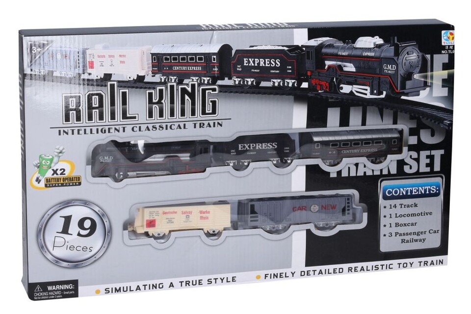 Sada obsahuje lokomotívu, 4 vagóny, 4 rovné koľajnice, 10 zahnutých koľajníc.