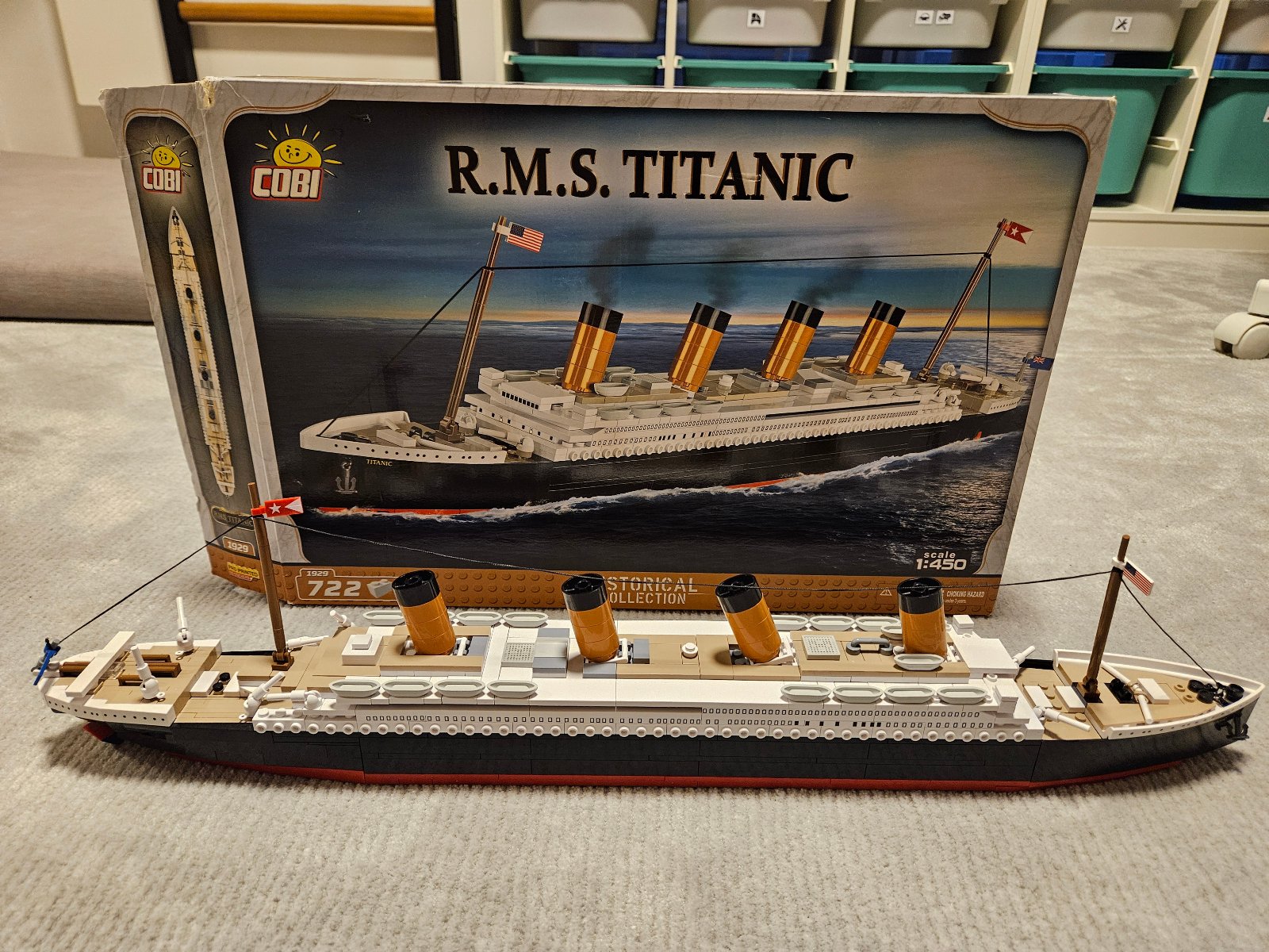 - Titanic (COBI 1929 Historical collection Zaoceánska loď R.M.S. TITANIC 1:450) - Verný model Titanicu zo 722 dielikov. Má pohyblivé časti a na spodnej strane lode sú kolieska, ktoré umožňujú pohyb na pevnej podložke. Zostavená loď má 64 cm na dĺžku a 15 cm na výšku - 39 eur