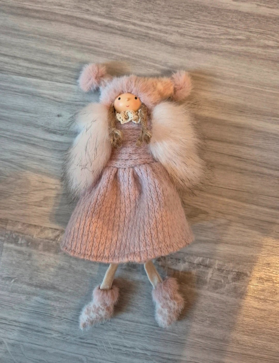 v-34 cm, š-16 cm,hl.-9 cm, dá sa posadiť,aj zavesiť, materiál: vlna, kožušinka, textílie, juta, polyresin, flauš