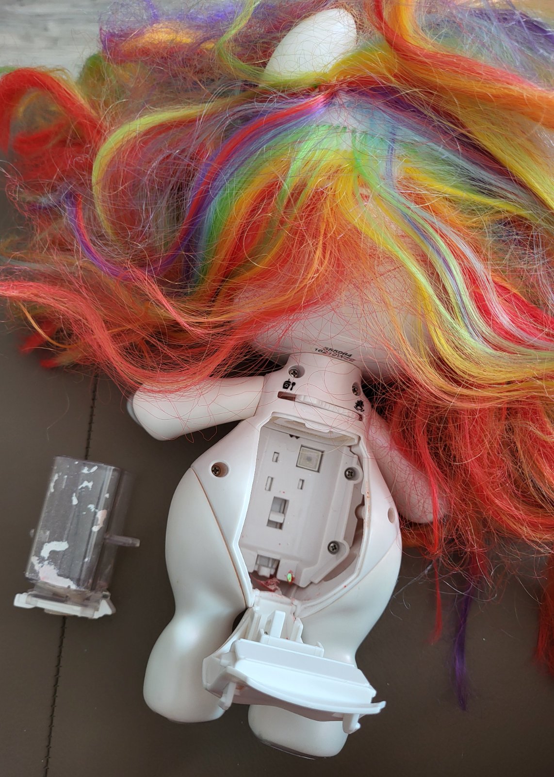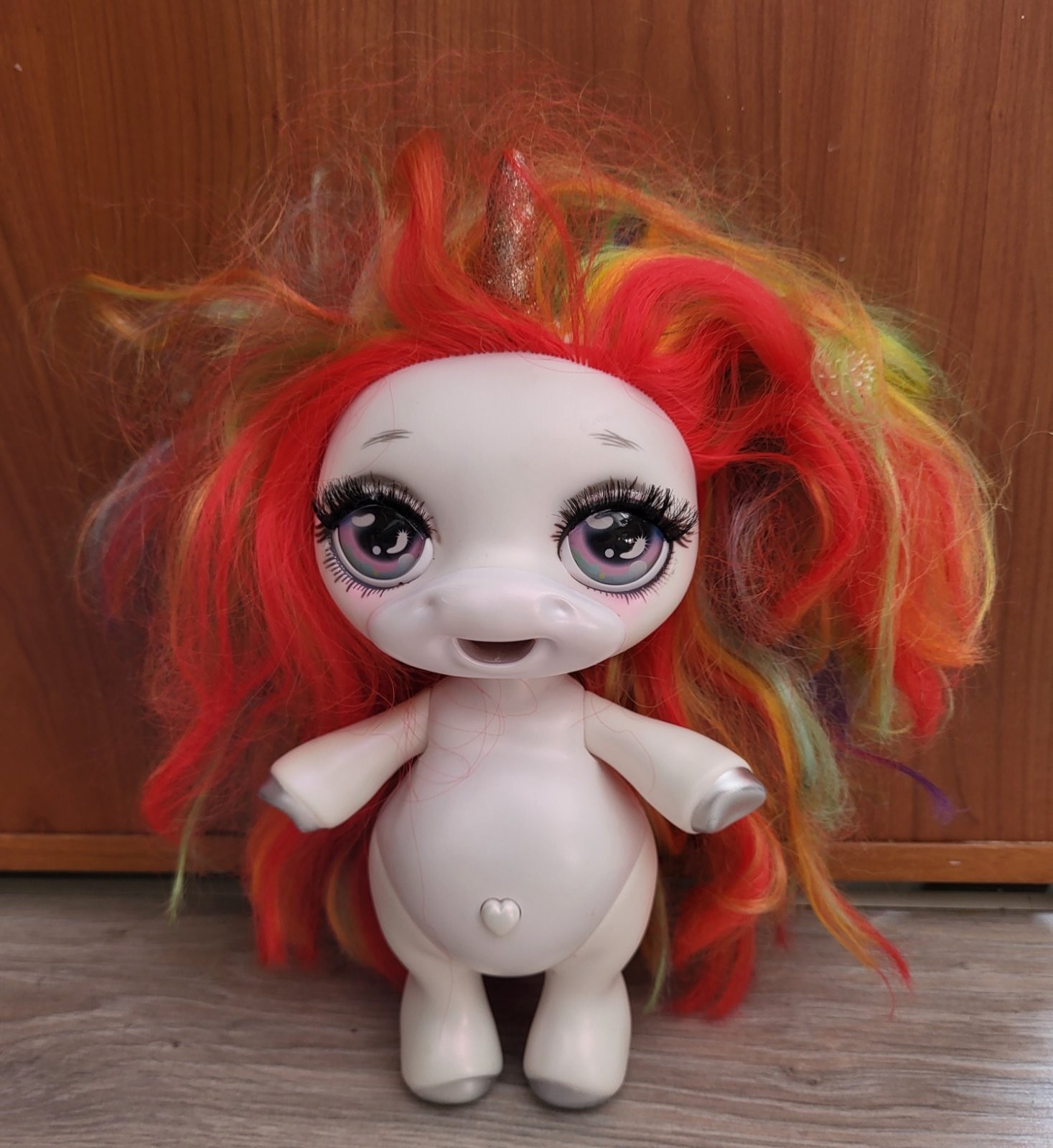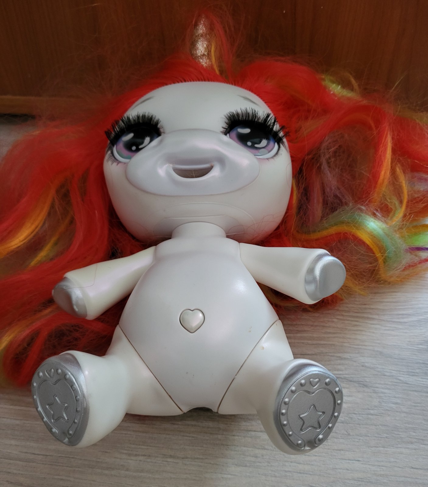 dobrý stav, je určená hlavne na výrobu slizu, do úst sa jej podáva špeciálna zmes(prášok Unicorn Food+voda), po ktorej sa v jej brušku vytvorí sliz, keď ju posadíte na nočník a stlačíte tlačítko(srdiečko)na brušku postará sa o "prekvapenie" v podobe farebného slizu, náplne nie sú súčasťou ale dajú sa kúpiť samostatne ako Poopsie Slime Refill, vlasy sú zachovalé, pošlem buď poštou alebo packetou