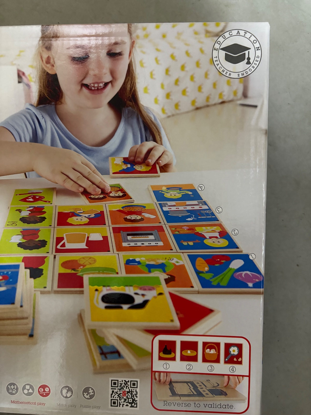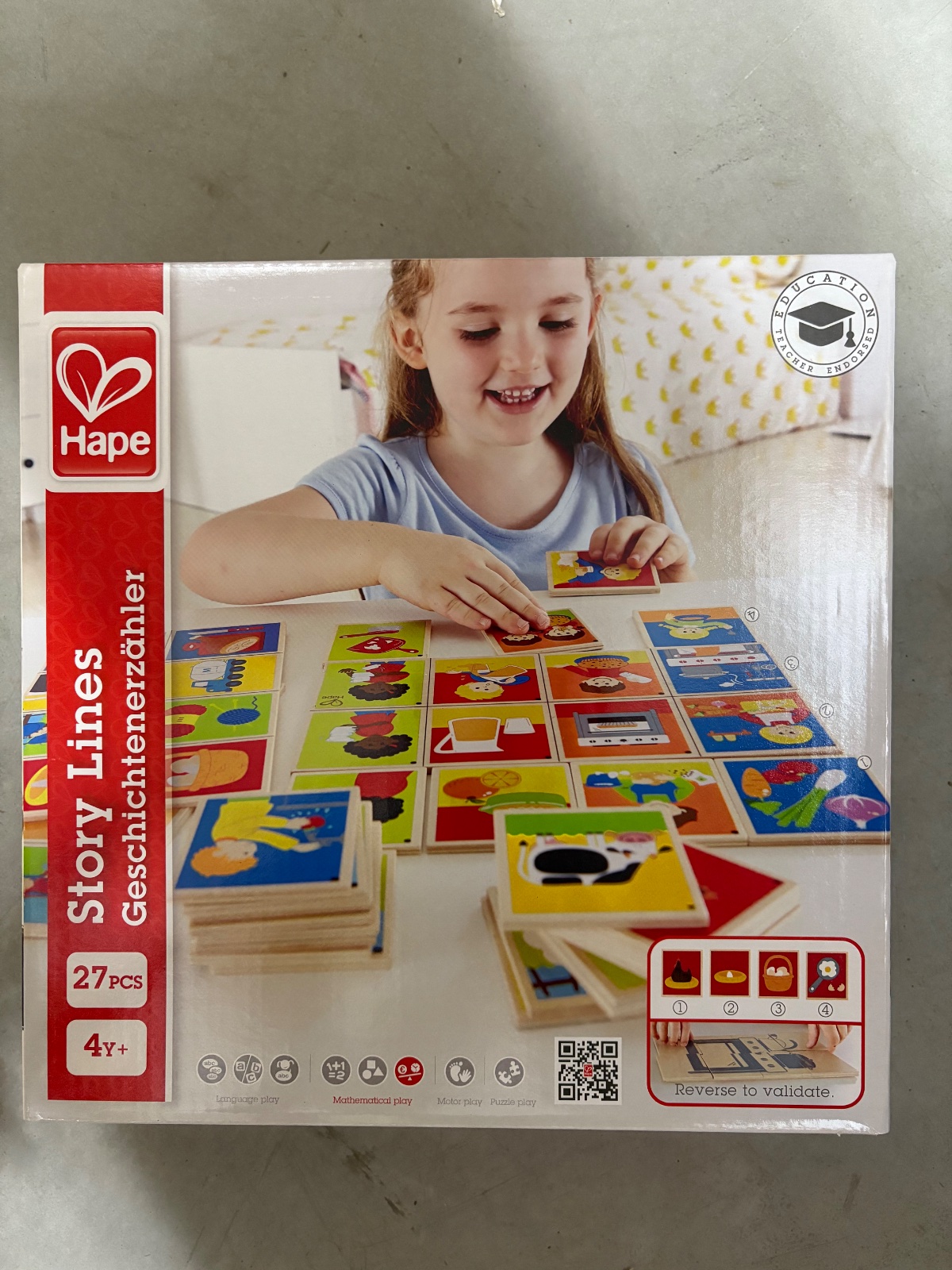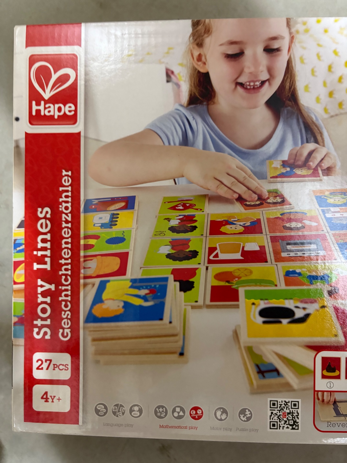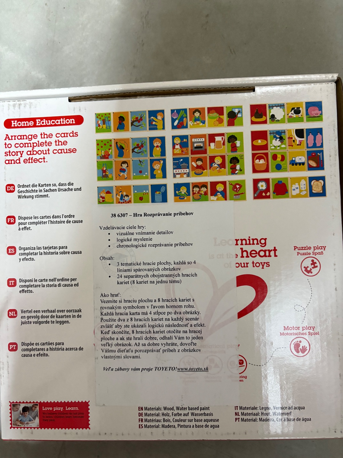 Hra "Rozprávanie príbehov" podporuje rozvoj vizuálneho vnímania detailov, logické myslenie, jemnú motoriku a koordináciu oka a rúk, či slovnú zásobu.