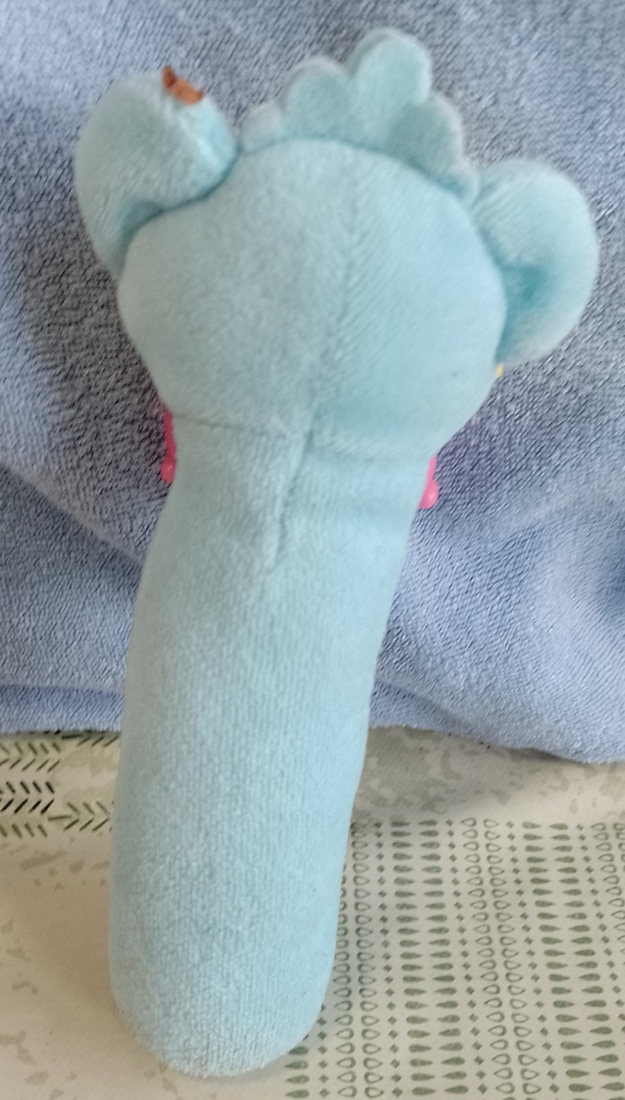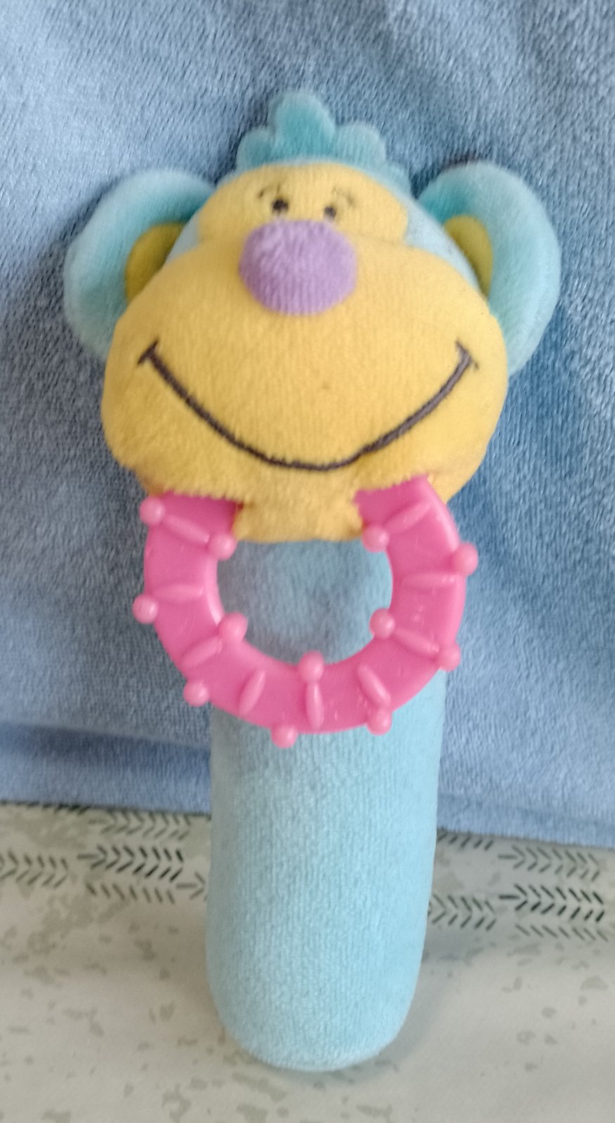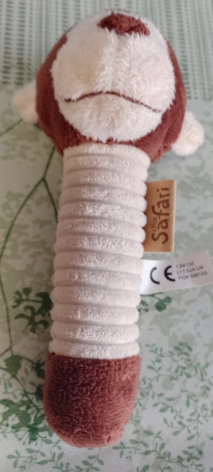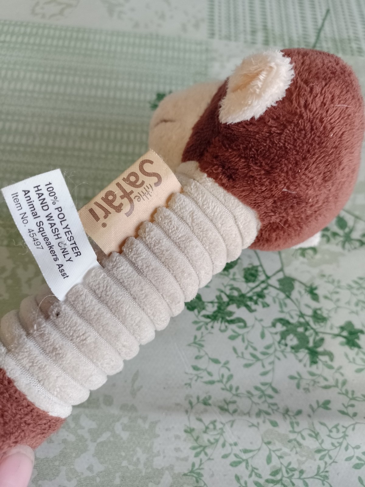 2 ks plyšová hračka Safari do ruky, hračky sú vhodné pre bábätká do ruky, na tyrkysovej je pripevnené hryzátko a hnedá hrká.