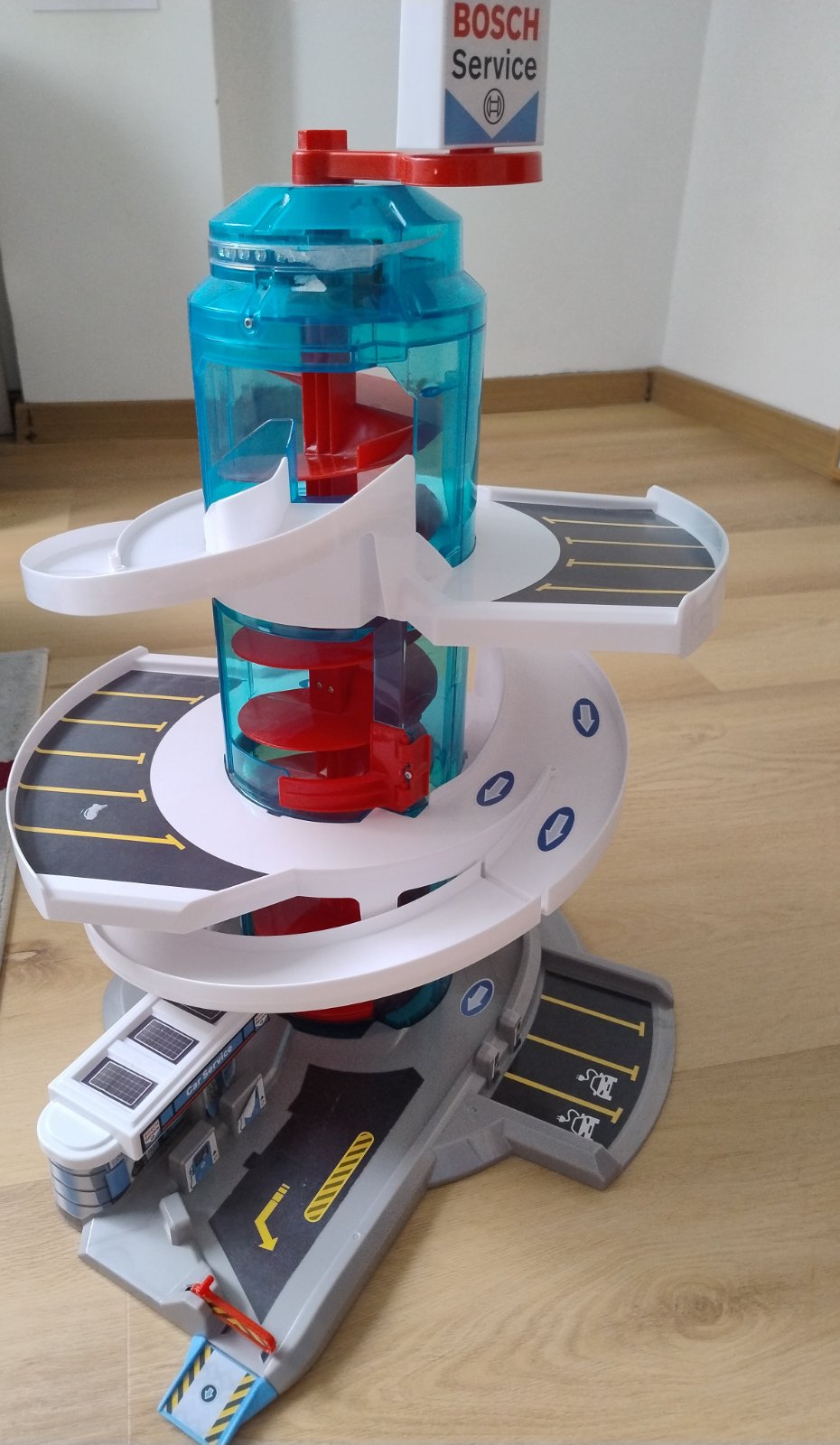 Veľmi málinko hraná poschodová garáž /autodráha značky Bosch poškodenia nemá (jedine nálepky sa miestami olupujú a hore je odlepená úplne viď foto)