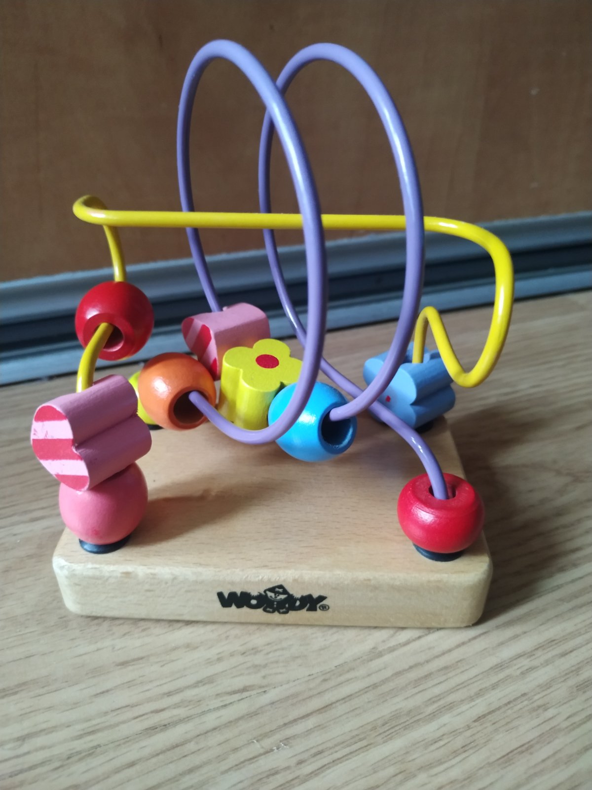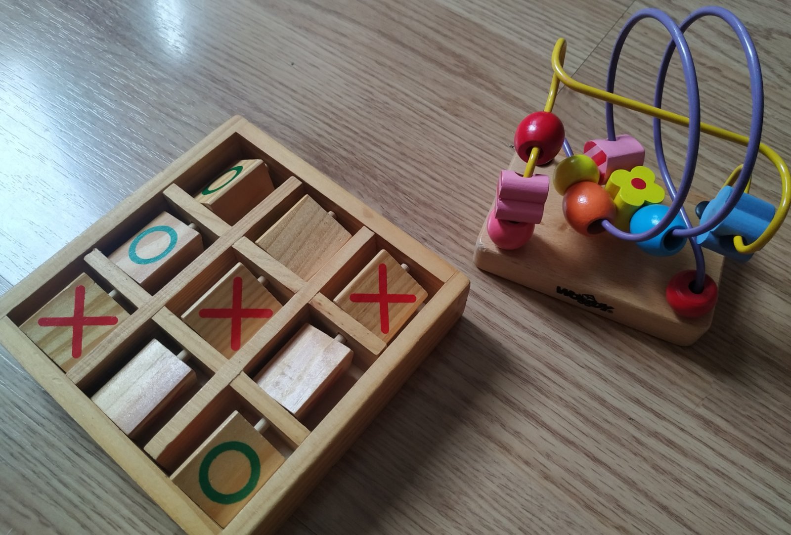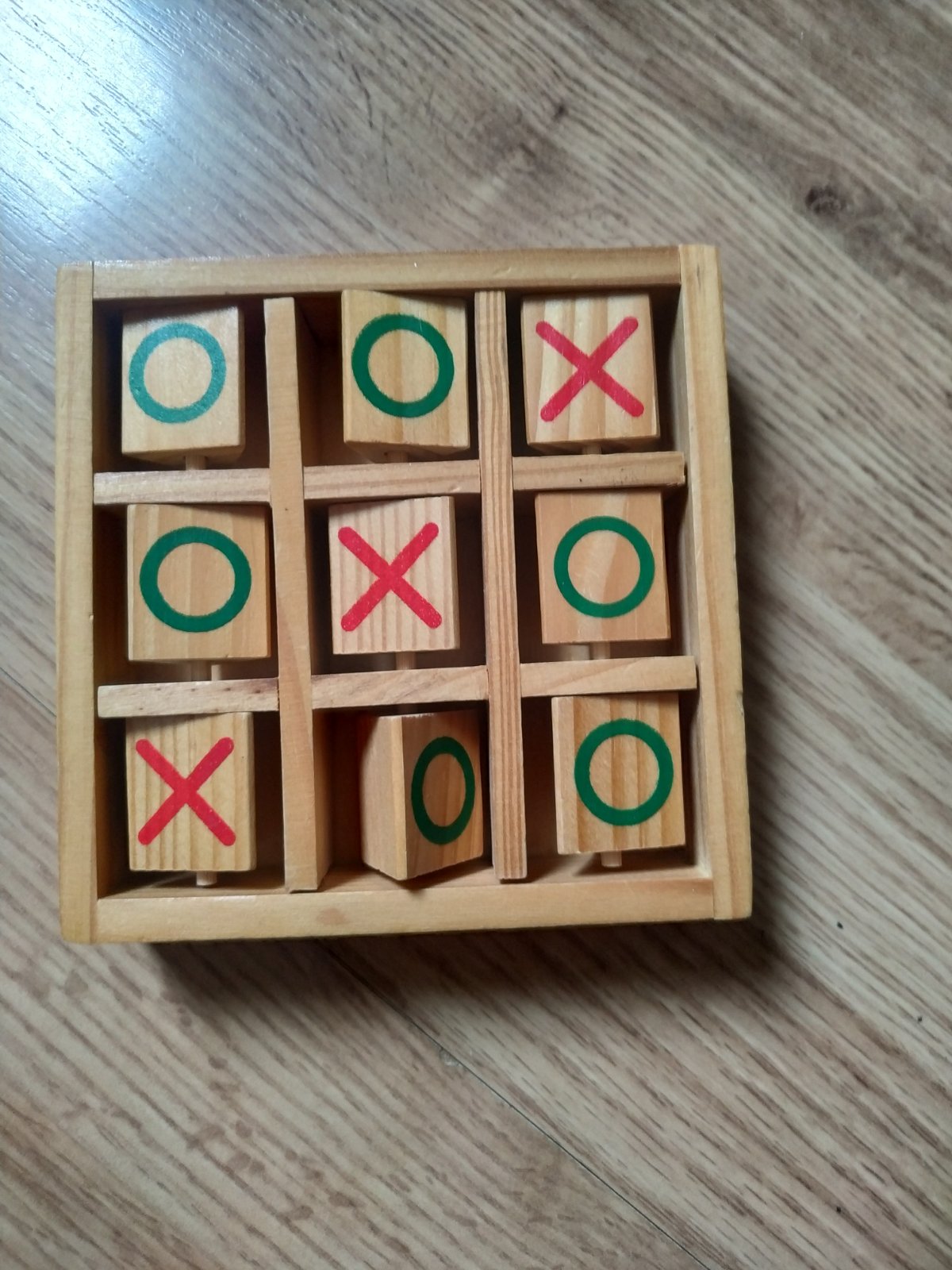 Hlavolam výborný stav.Veľkosť 10x6,5cm.Drevené piškvorky pridávam ako darček, majú jemné známky používania. Symboly sa zatočia a ktoré padnú ostávajú. Náš malý si to krútil len tak, pre radosť.