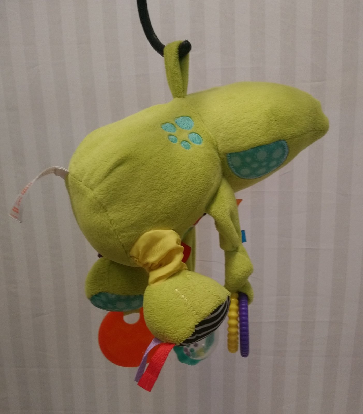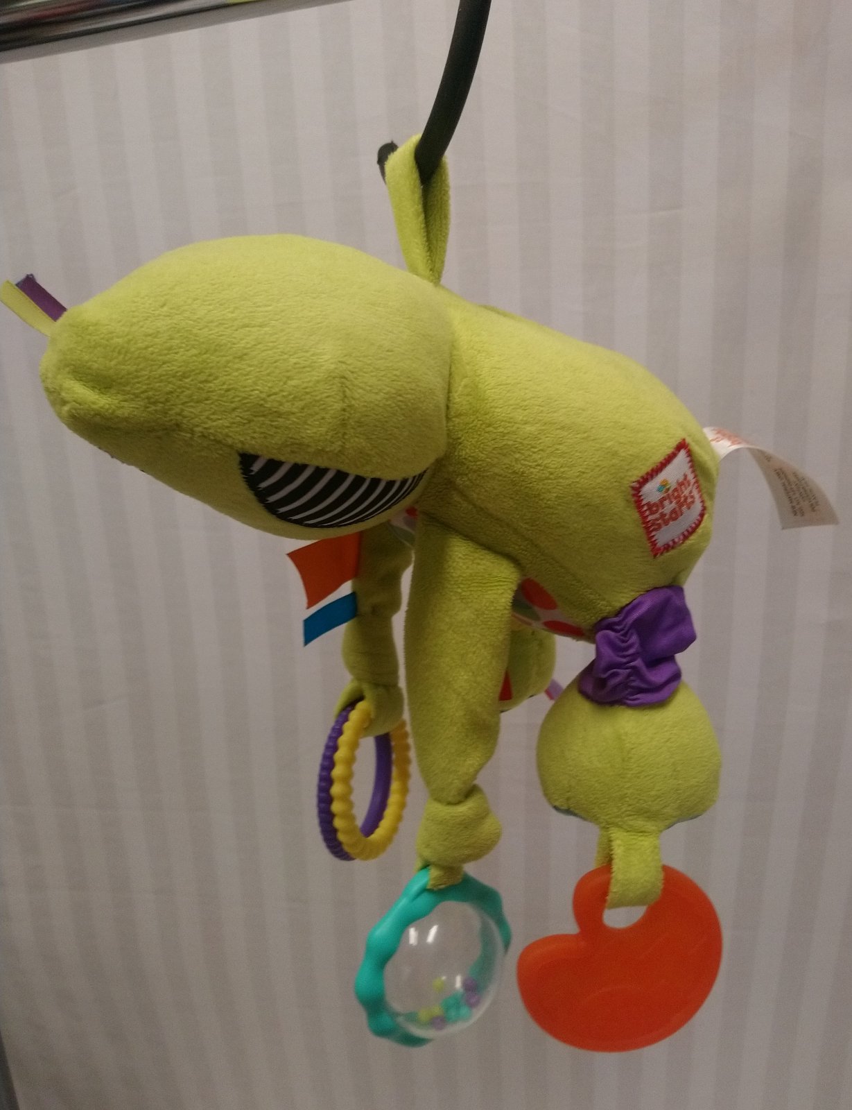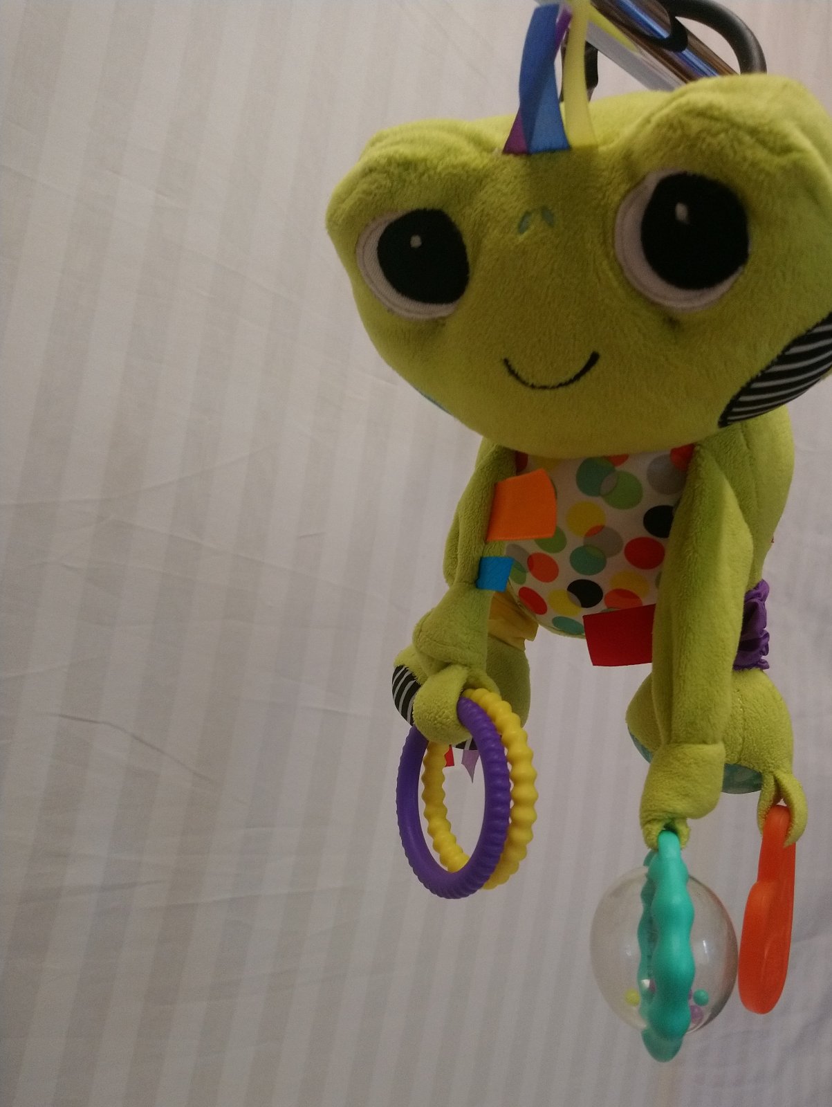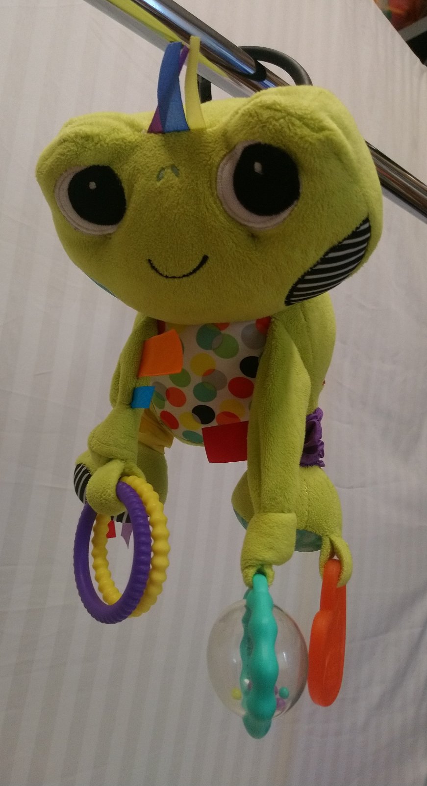 plyšová zavesovacia Žaba je prekrásna žabka, ktorú možno zavesiť alebo len tak posadiť. Na pravej ruke má krúžky a látkové pásiky, v ľavej ruke drží hrkálku, na ľavej nožičke má pripevnené hryzátko. Rôzne časti tela sú vyrobené z rôznych materiálov preto si pri tejto hračke vie dieťatko rozvíjať hmat, sluch je rozvíjaný vďaka hrkaniu a šušťaniu jednotlivých materiálov a zrak podporujú rôzne farby, ktoré na žabke sú.