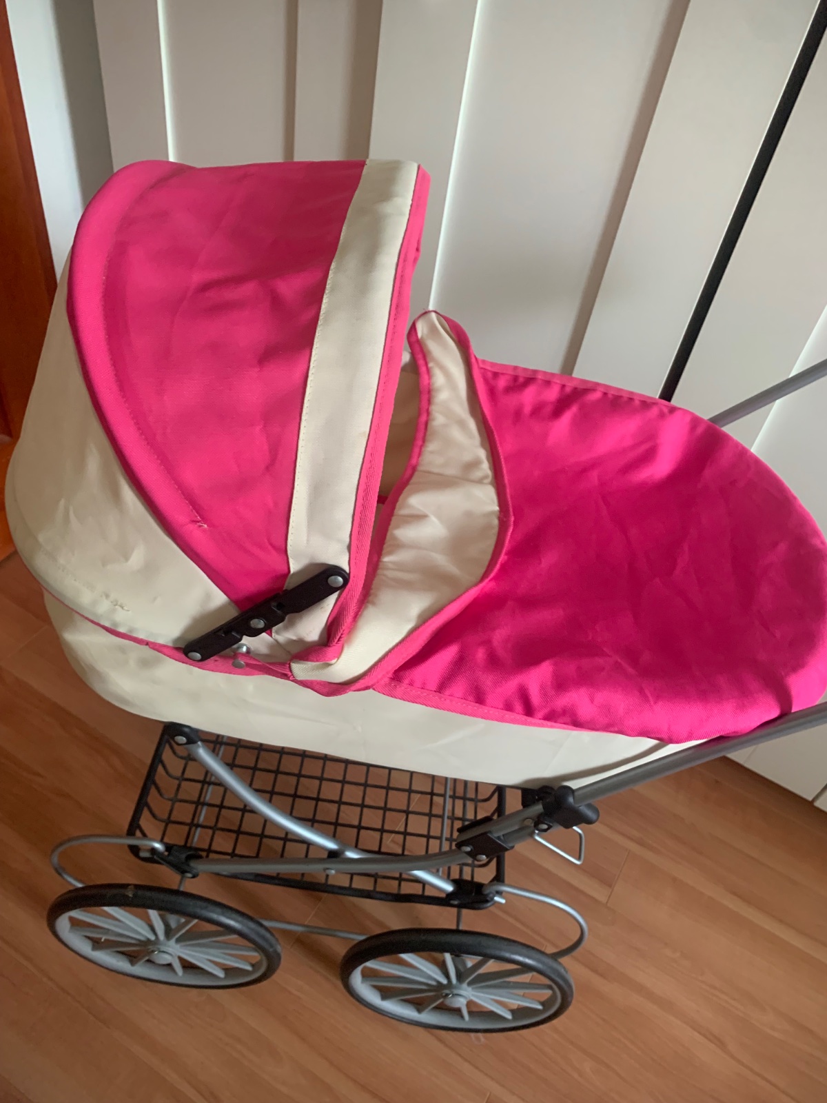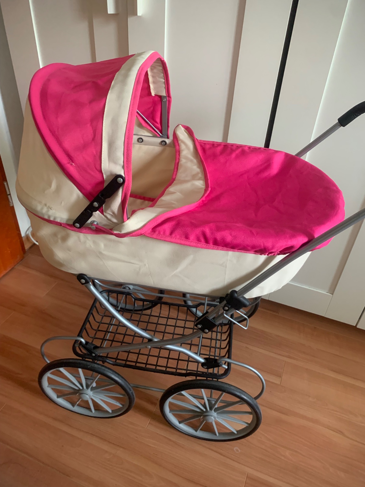 Krásny, kvalitný a veľmi zachovalý kočík pre bábiky. Je vhodný pre deti cca 3-4 ročné. Výška rukoväte 50cm.