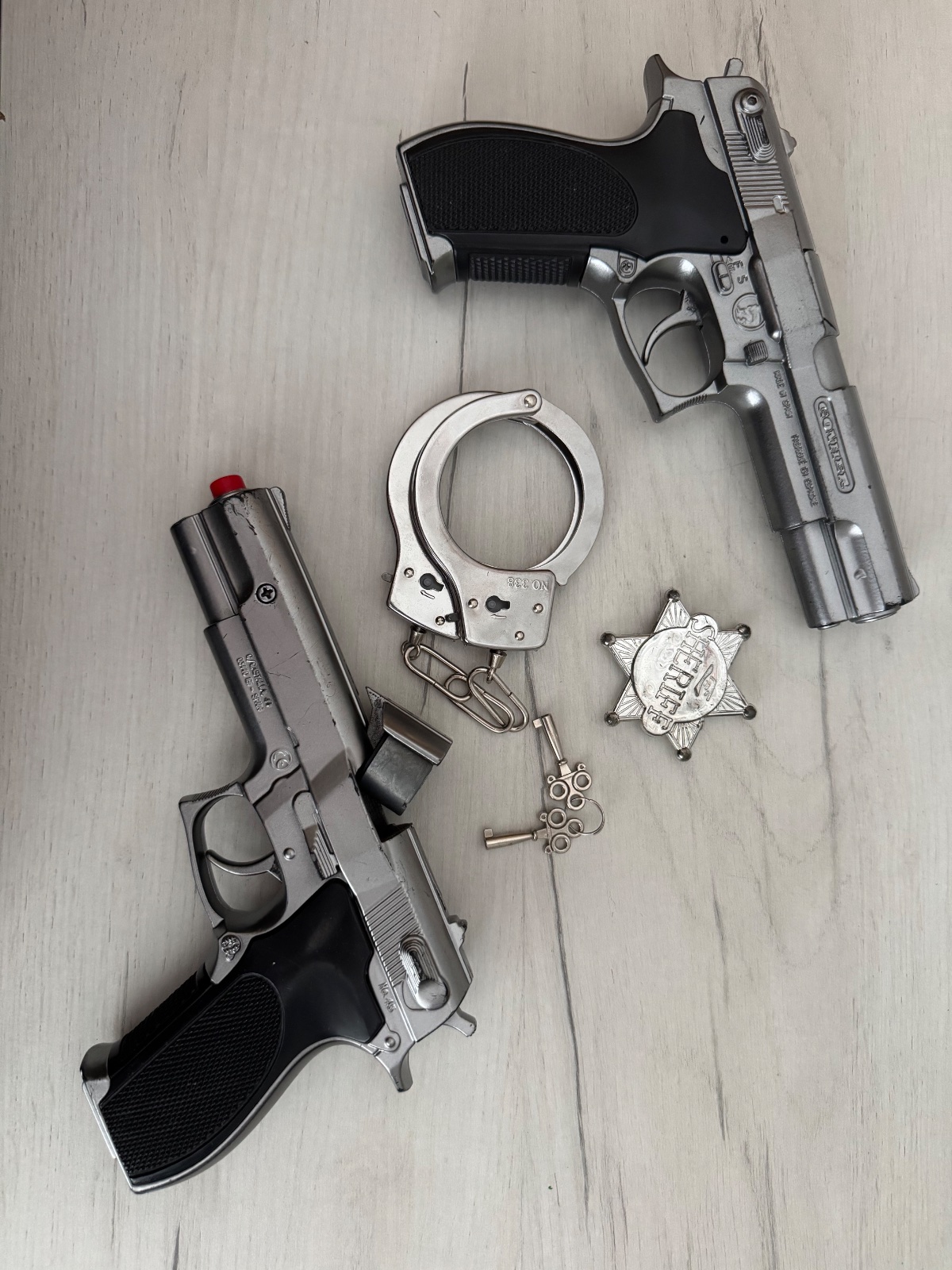 Pištole z kovu na kapsle , plus putá na kľúč a hviezda šerif. Jedna zbraň za 4 e alebo spolu komplet za 7