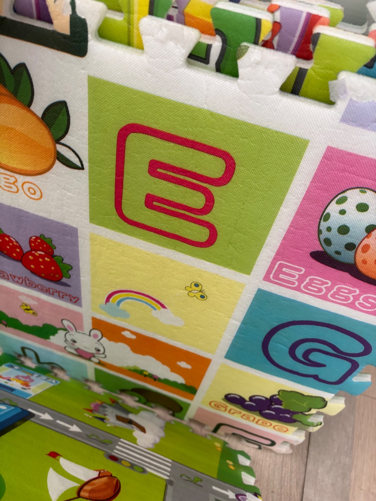 veľké obojstranne puzzle na zem s abecedou a z druhé strany cestičkou na autá.. na jednej časti je vyrezané mala dierka🙈.