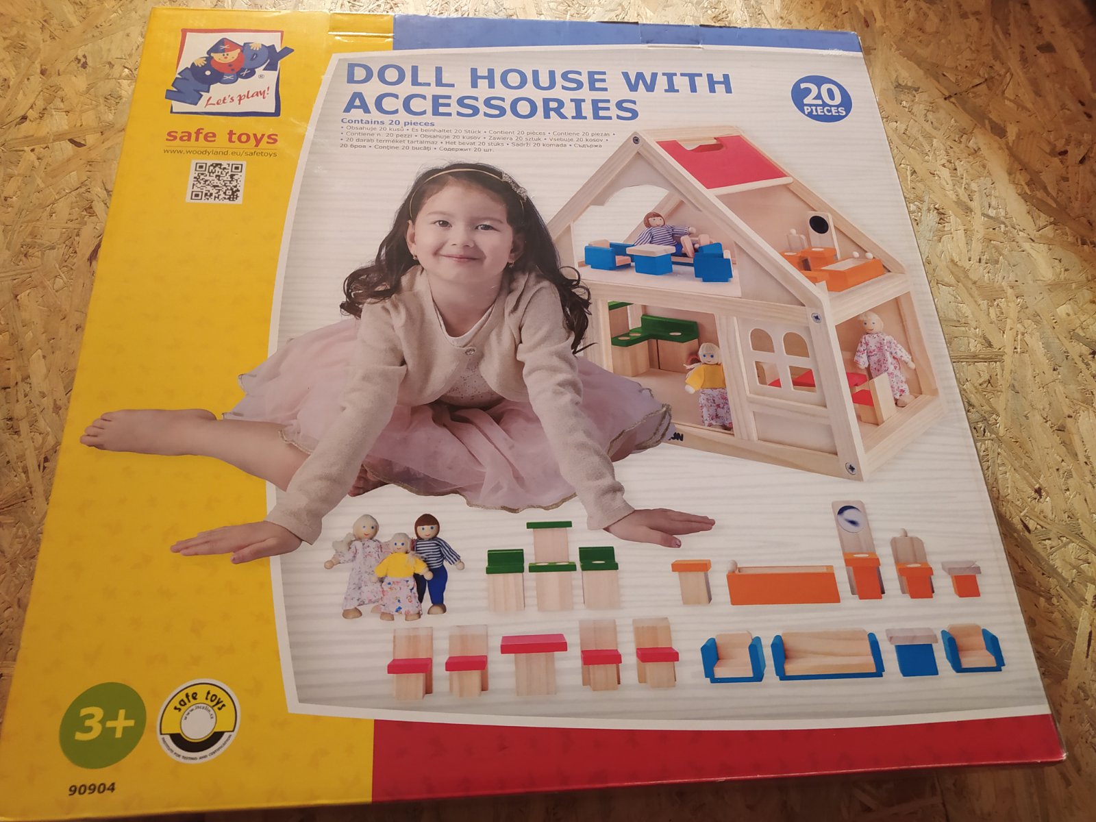 Krasnt drevený domček s bohatým príslušenstvom, drevený nábytok originál k domceku, plastový na terasu + postavicky dokúpene. Bez poškodení, nic nechýba, len bežné známky používania - oder na stre...
