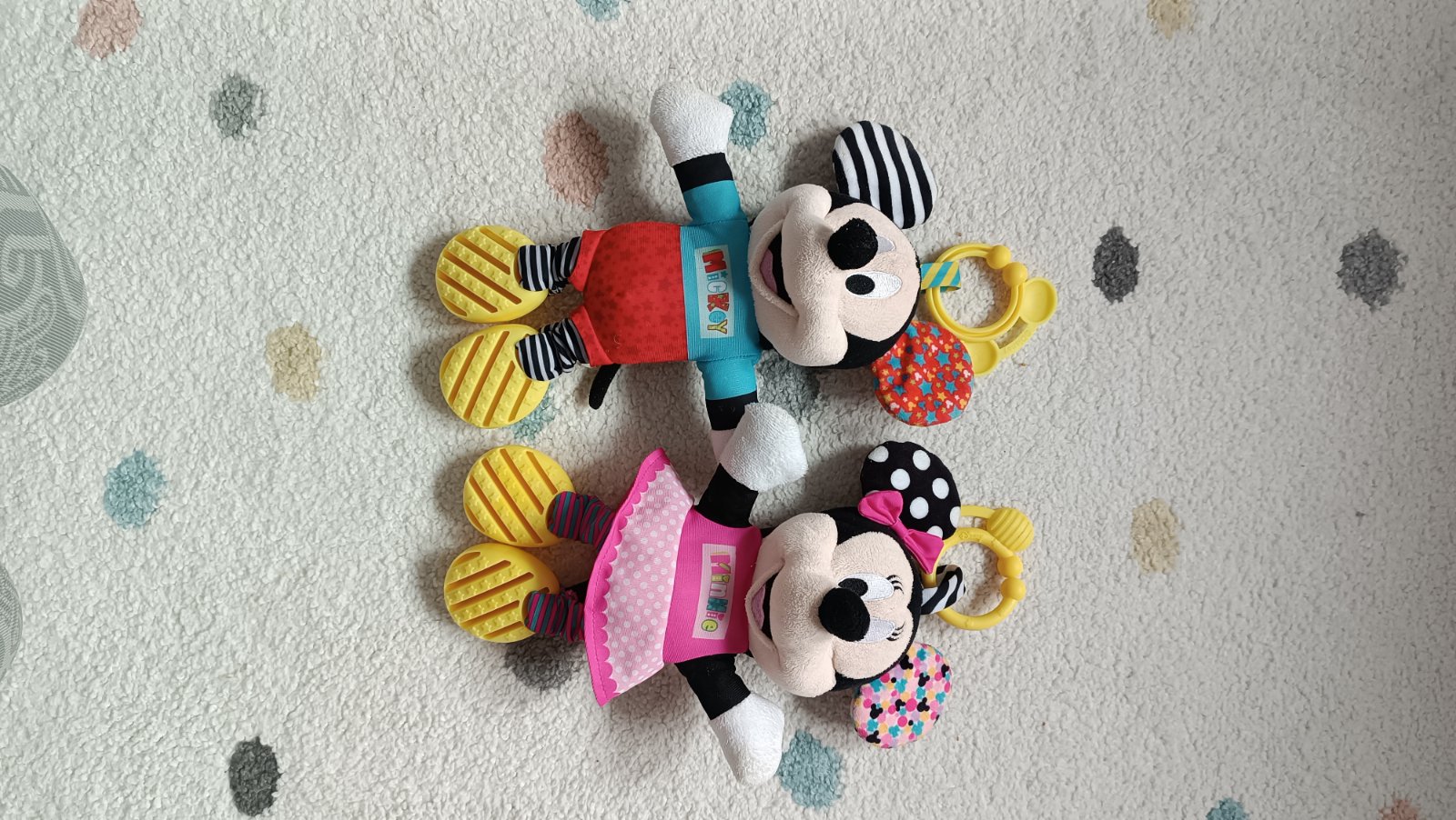 Zvukove hracky na kocik mickey+minnie v top stave.piskaju,hrkaku,šuštia.daju sa zavesit na kocik.mozu sa prat v pracke.