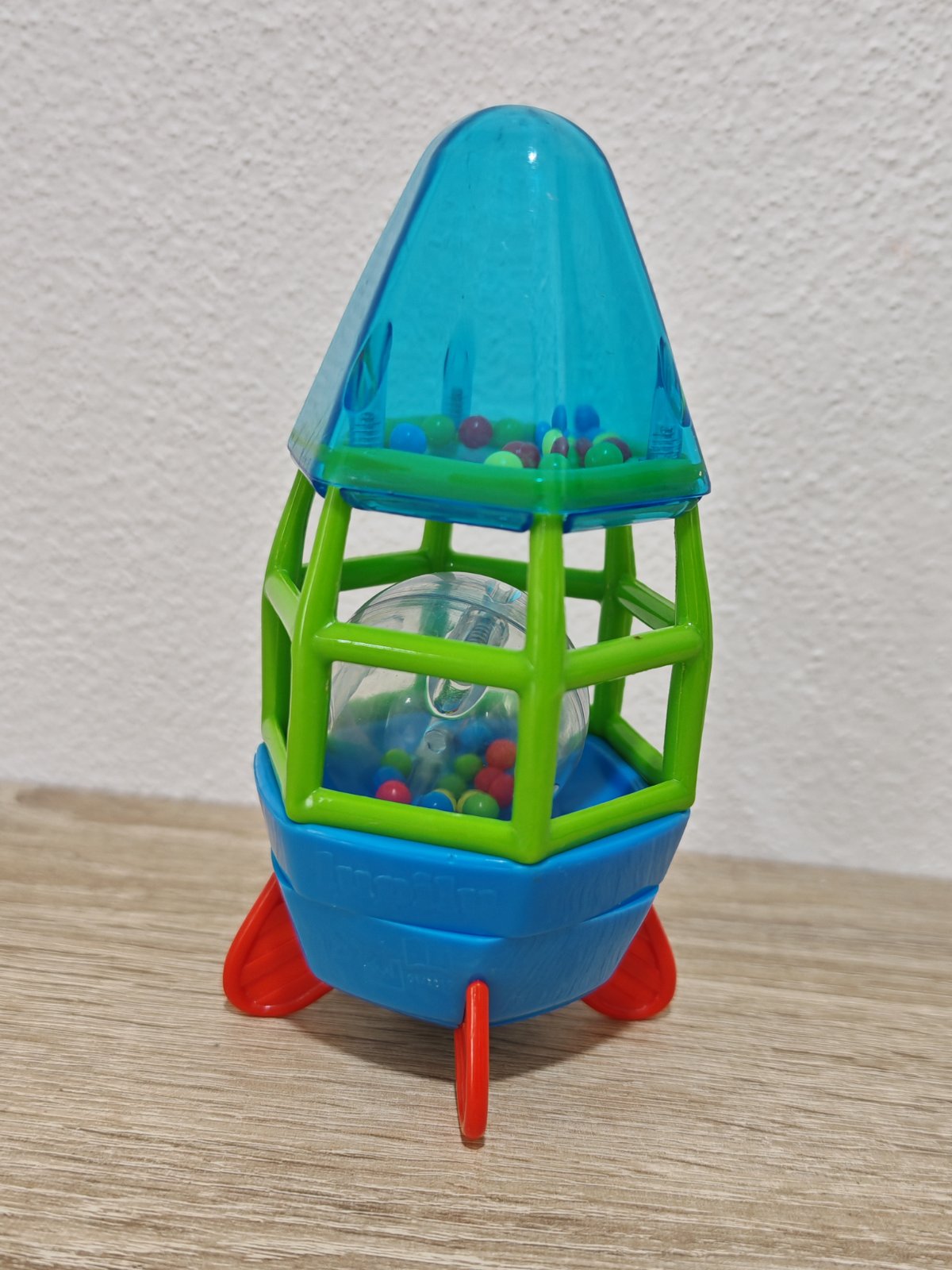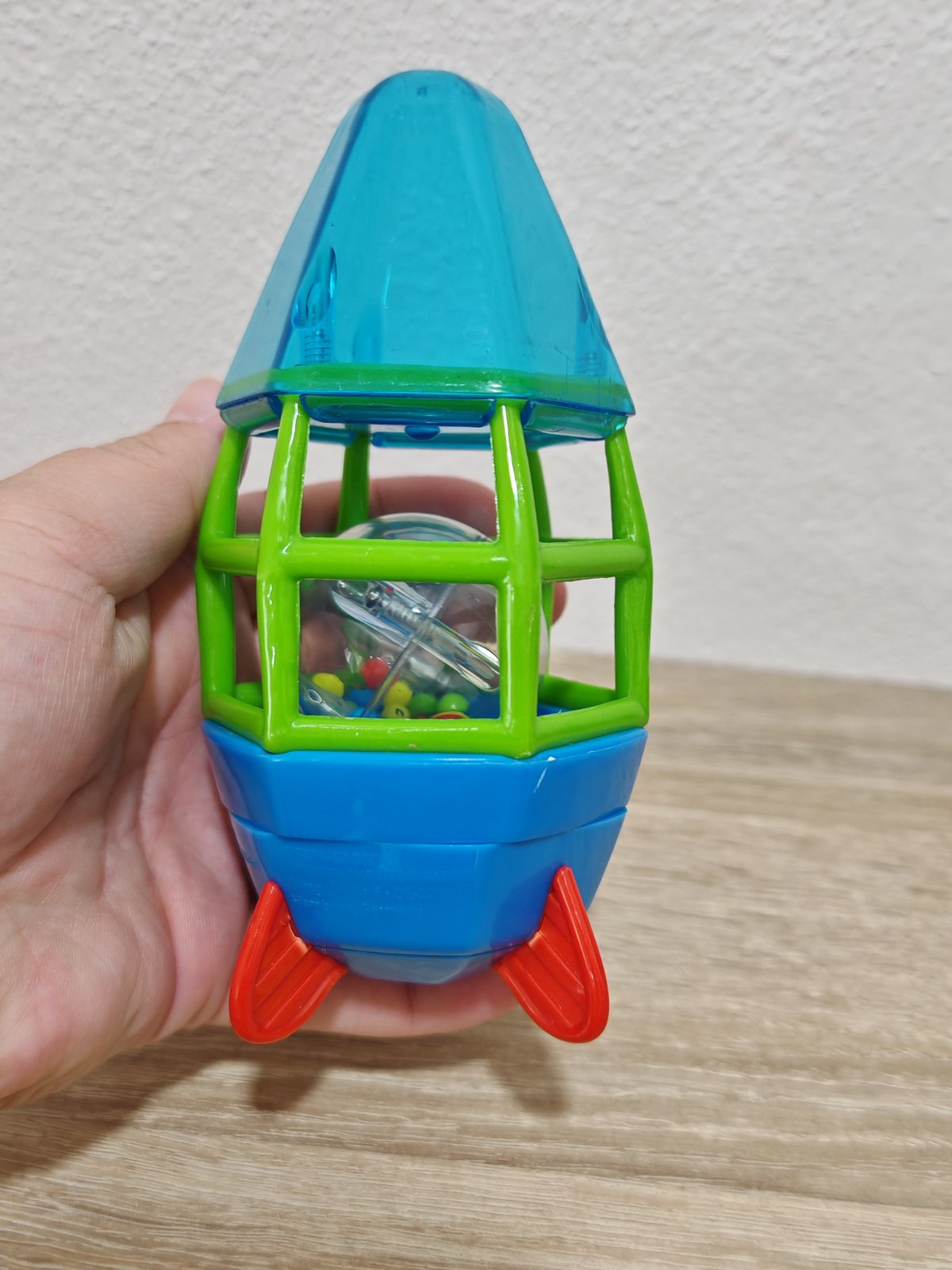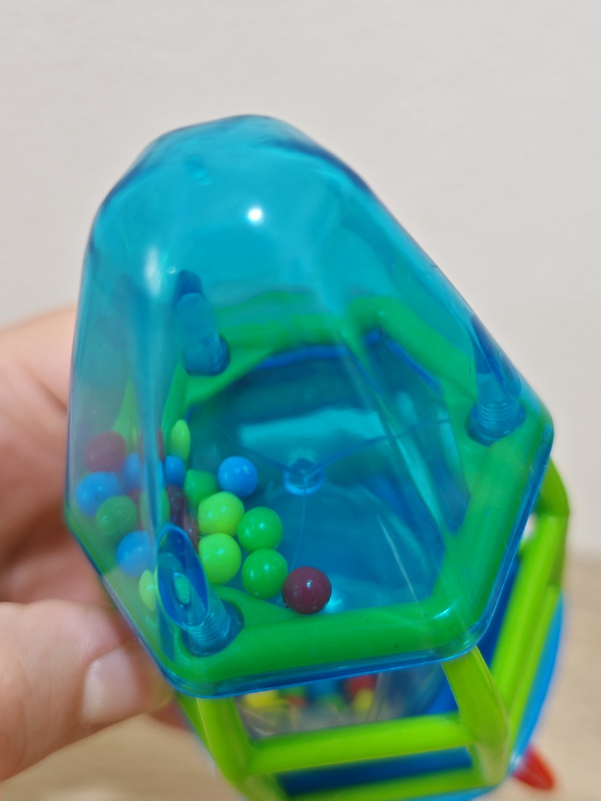 Až pri fotení som si všimla, že jeden plast je puknutý - viď foto, ale drží to tak. Spodok s červenými nožičkami sa točí a rapoce.