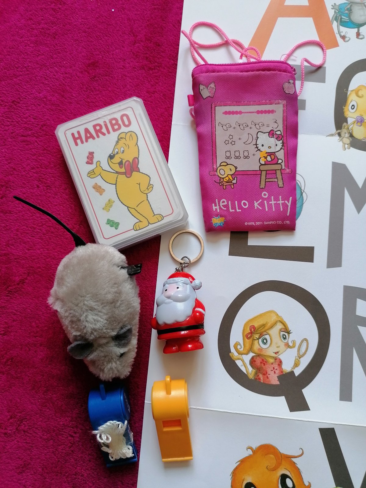Plagát s písmenami, tabuľky na kreslenie s fixkami, karty nie sú komplet, myš, 2x píšťalka, prívesok na kľúče so zvukom, taštička Hello Kitty.