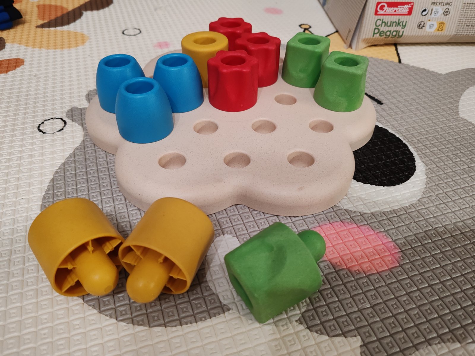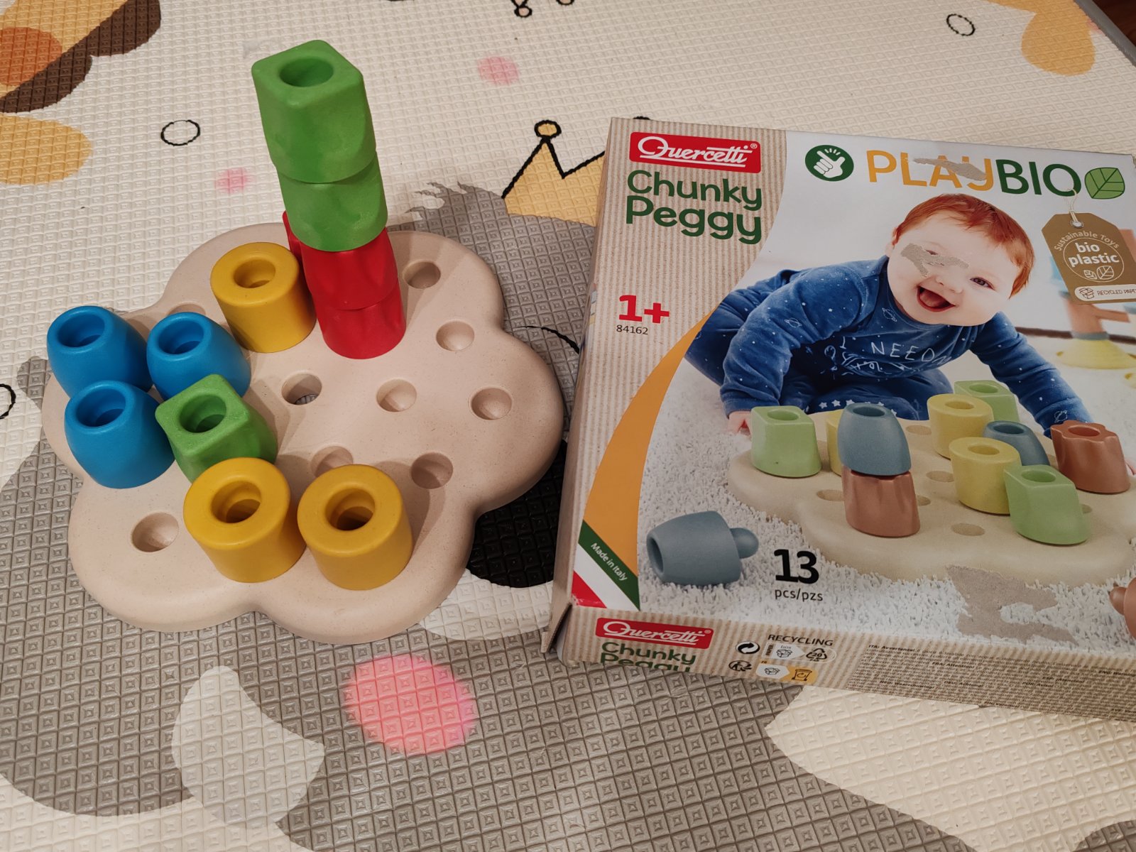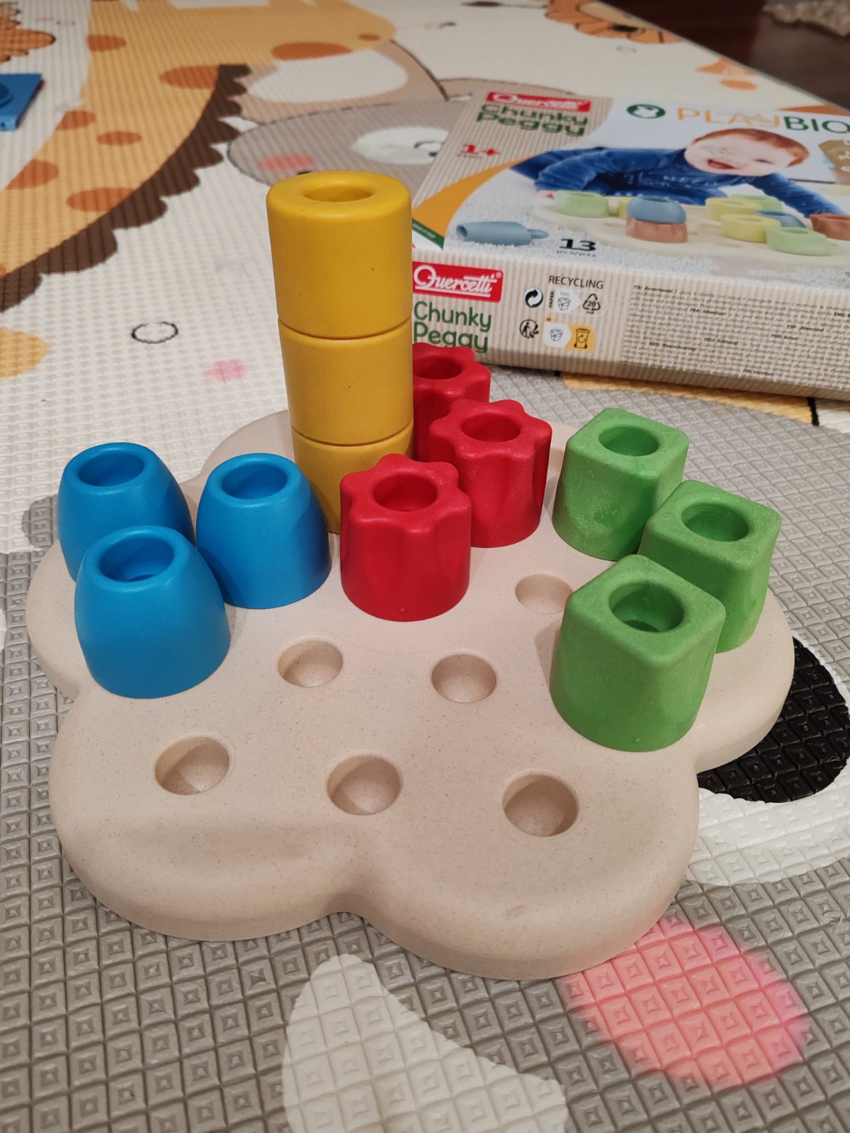 Prvá skladačka pre bábätká s podložkou a 12 farebnými kockami. Dajú sa ukladať na seba alebo na podložku. Dieťa môže trénovať prvé úchopy a koordináciu ruka - oko.