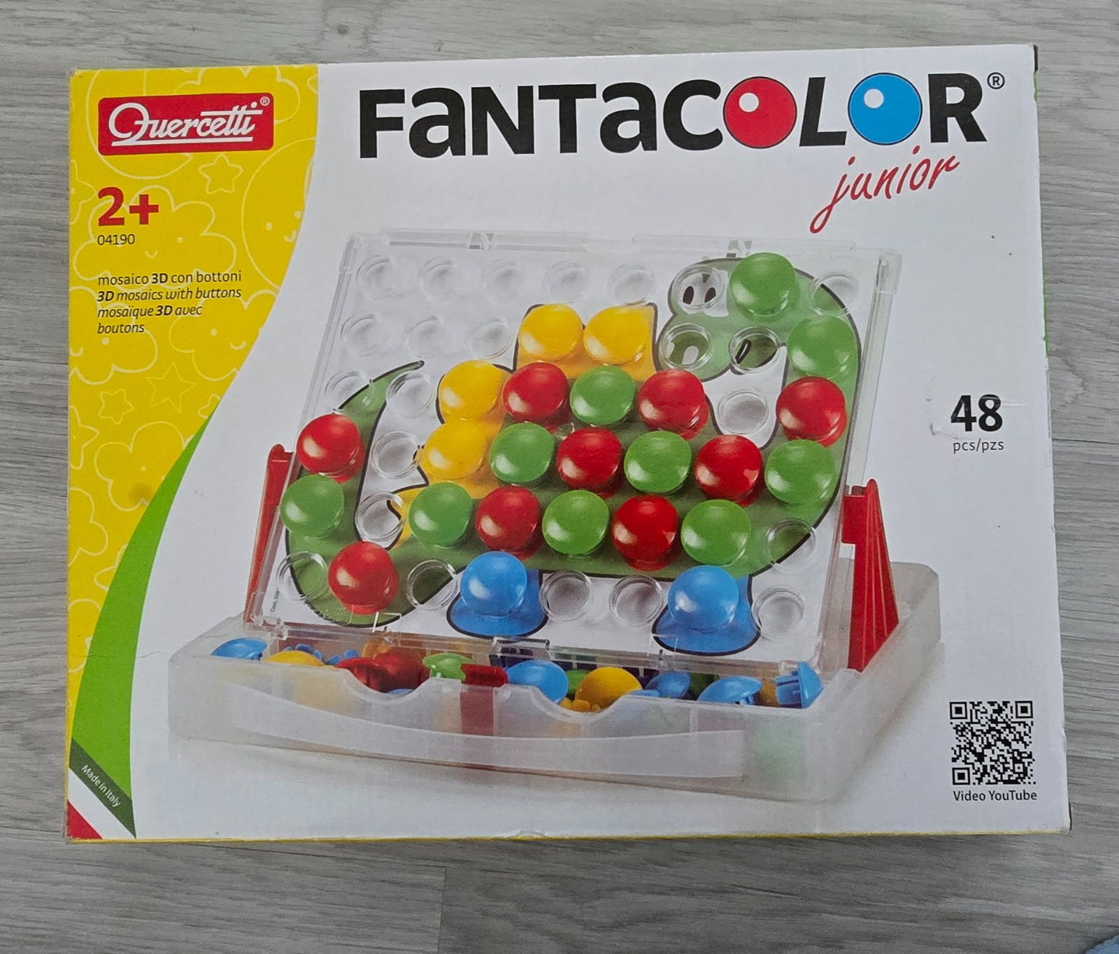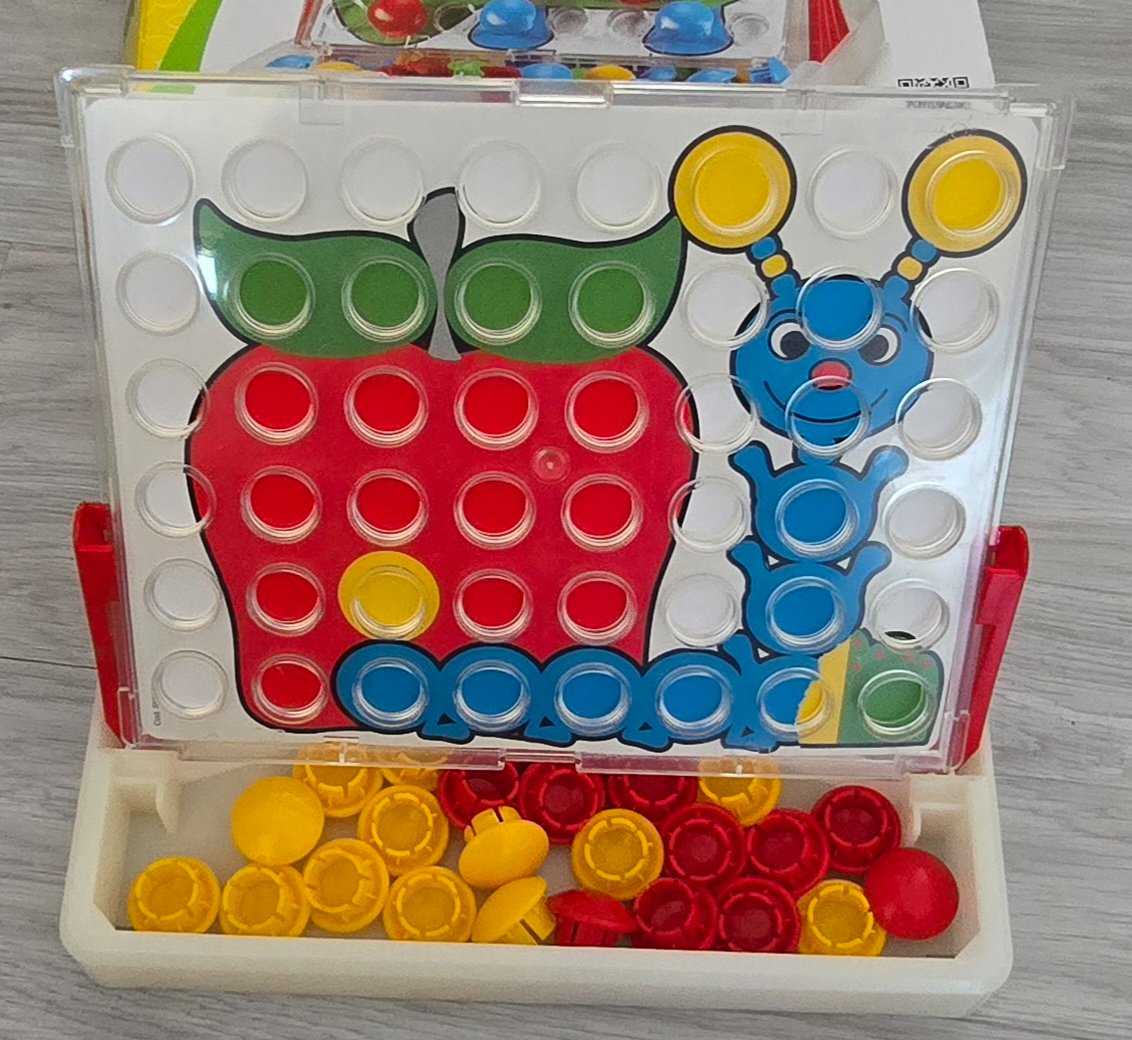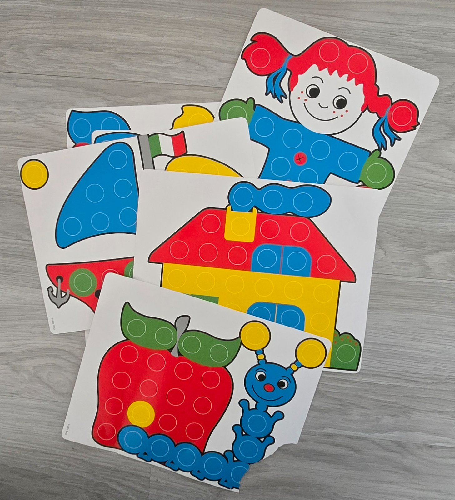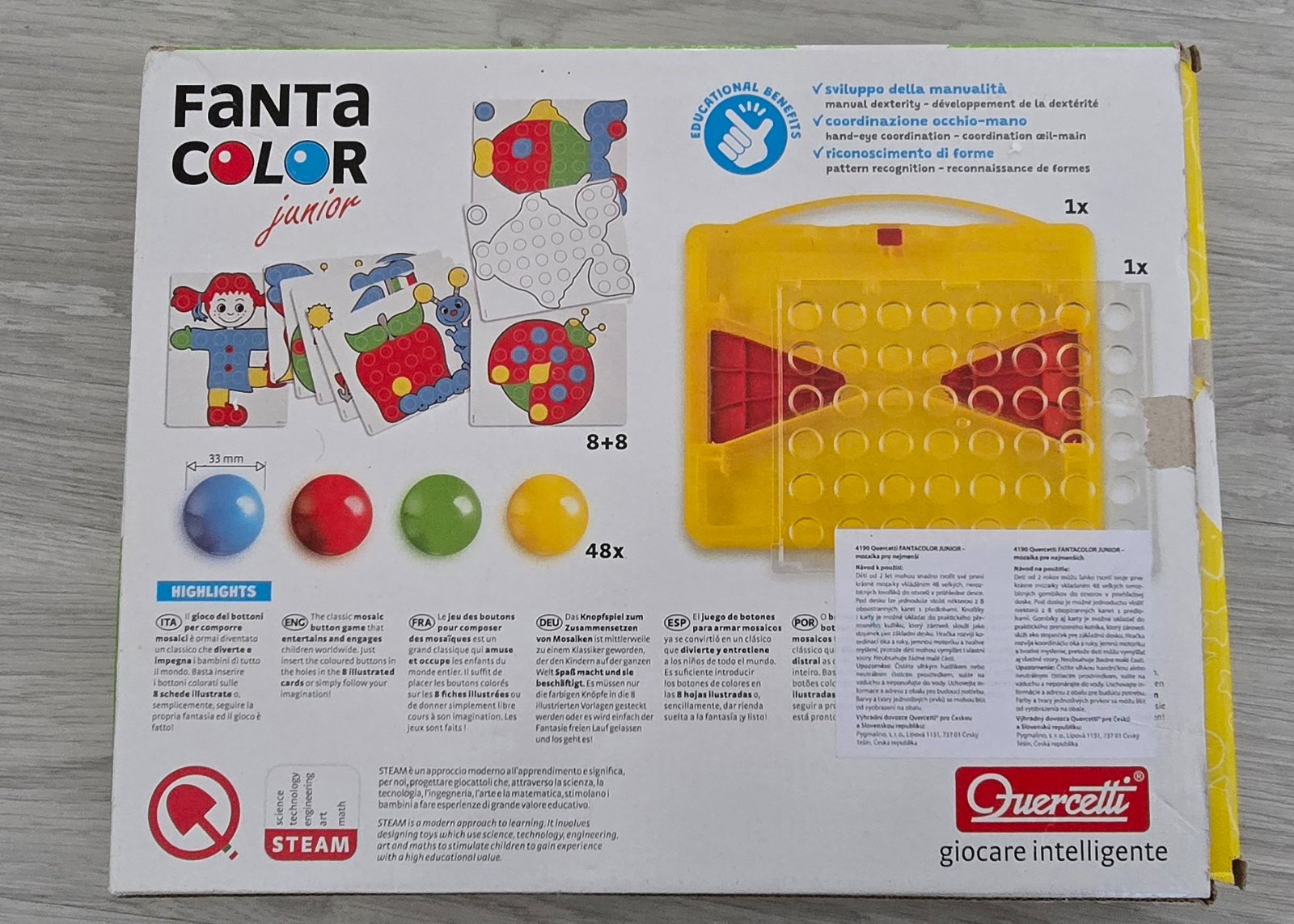 Didaktická mozaika pre deti od 2 rokov. Súprava rozvíjajúca detskú motoriku, tvorivosť a fantáziu sa skladá z hracej dosky s otvormi, 48 veľkých farebných gombíkov (priemer 32 mm) a 8 obojstranných kariet s predlohami.