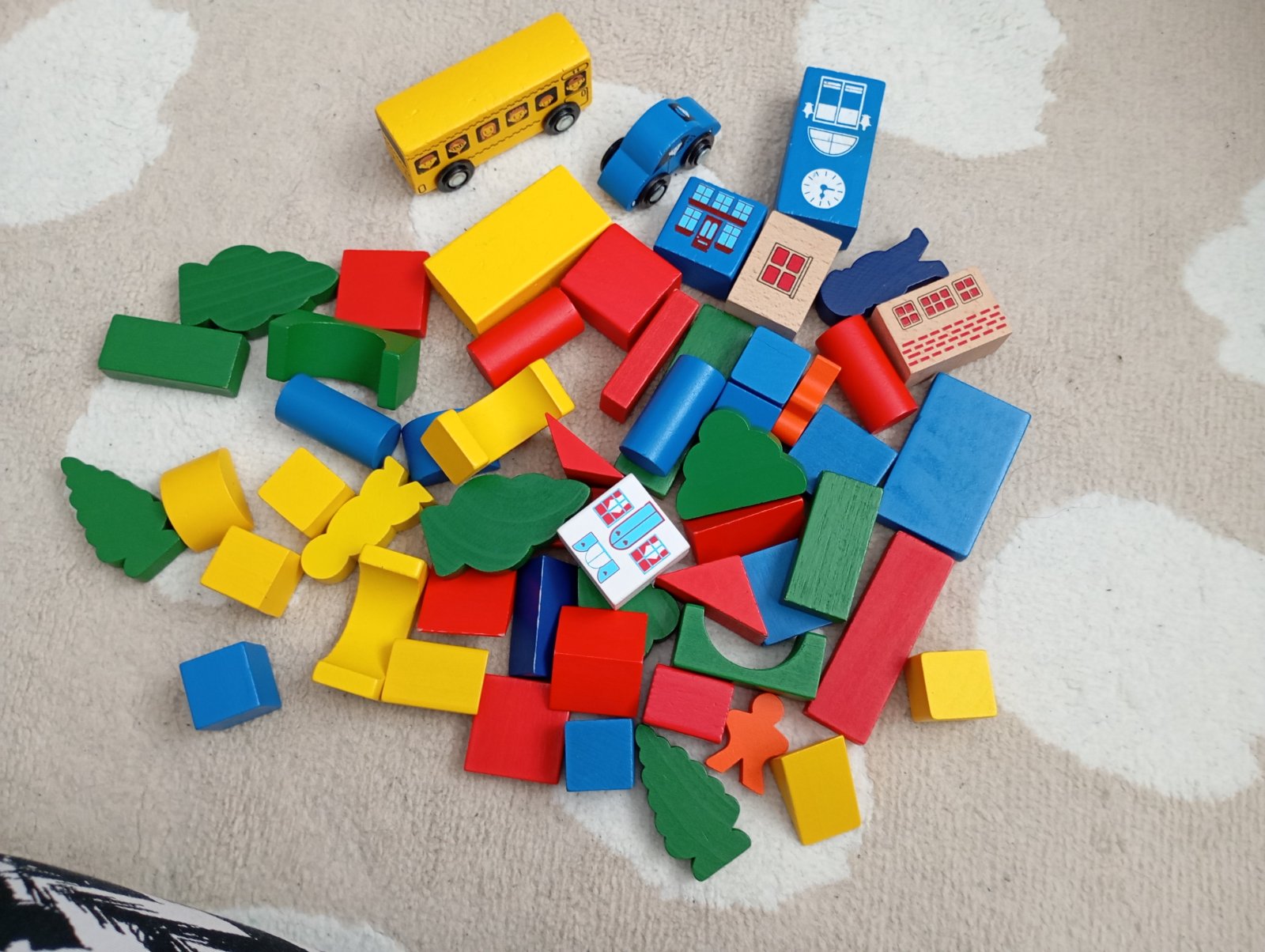 Drevená stavebnica- mestečko, dopr prostriedky, budovy, stromy, ludia