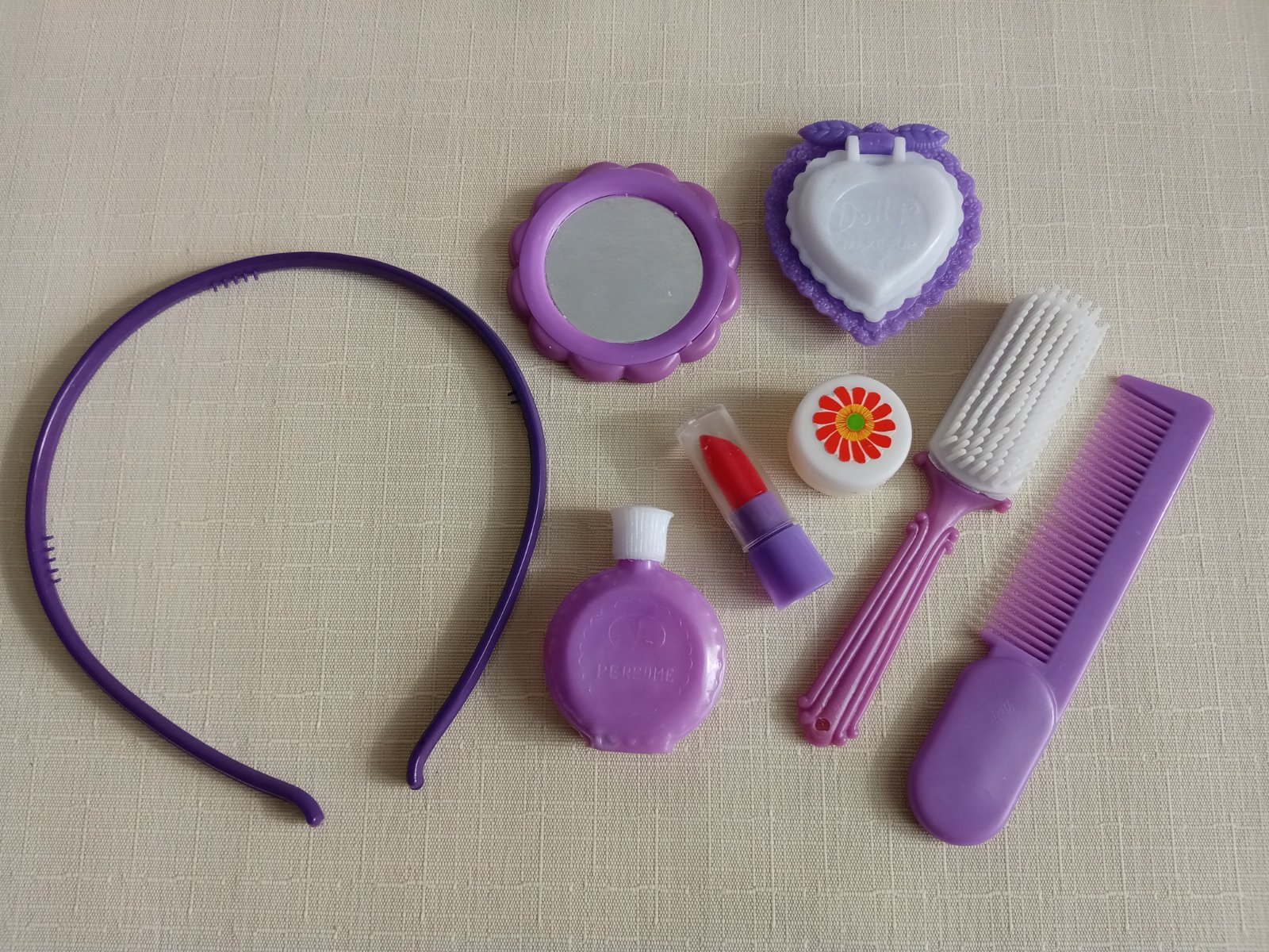 Sada pre malé parádnice a ich bábiky. Kefka, hrebienok, zrkadielko (len s lesklou fóliou, nie skutočné), čelenka, "akože" rúž, parfém, krémik, atď. (Nádobky a fľaštičky sú, samozrejme, prázdne.)
