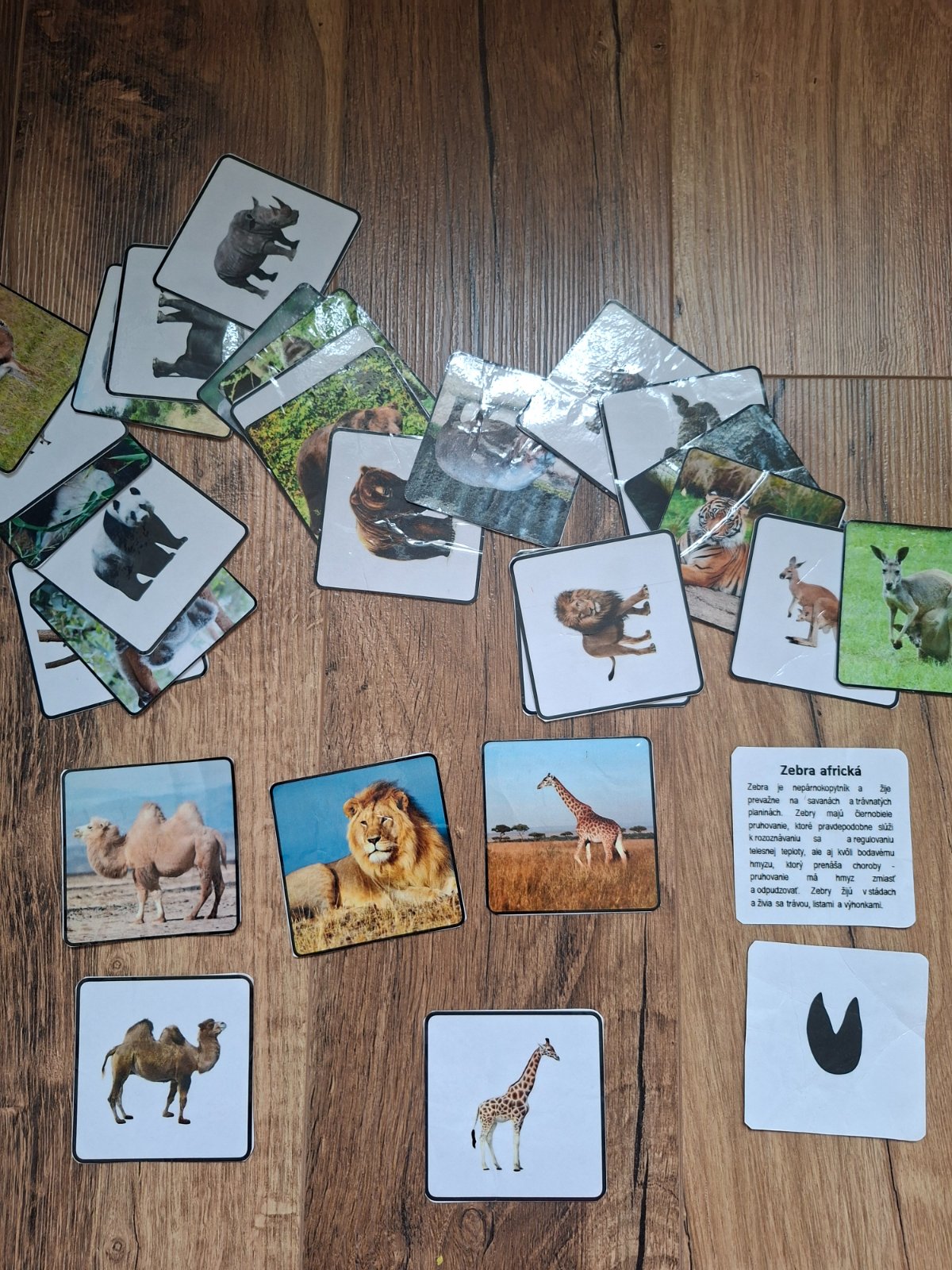 Kartičky exoticke zvierata 14 parov, na jednej kartičke je kratky popis ku zvieratku a na druhej karticke je jeho otlacok