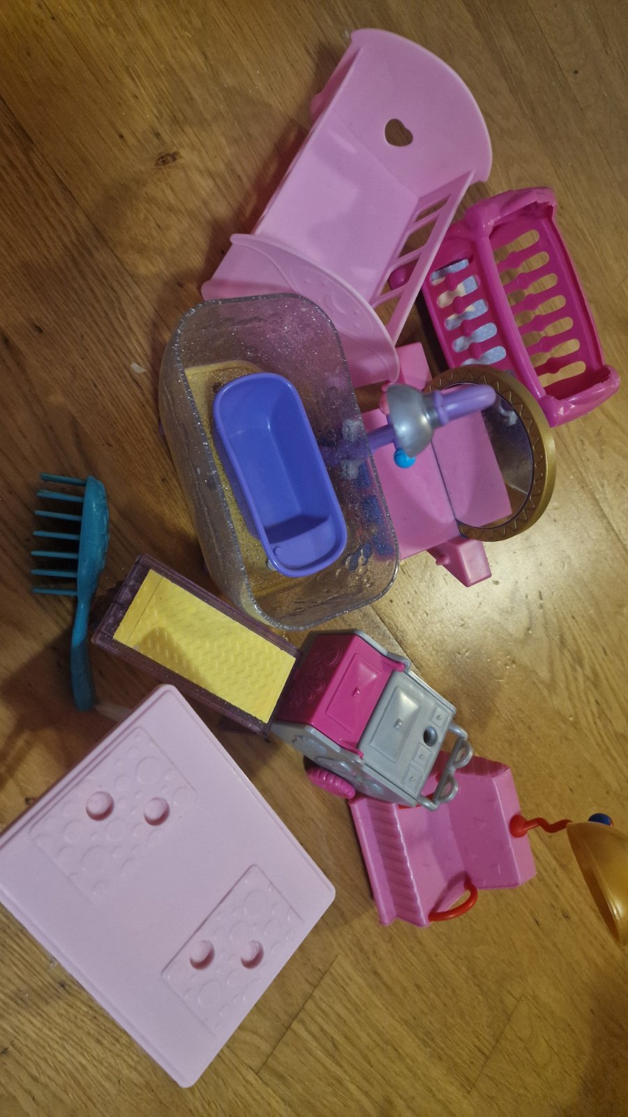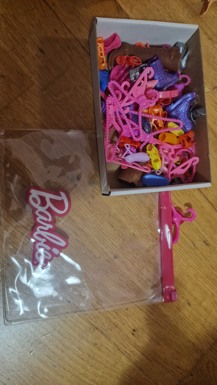 Barbie 10 ks, oblečenie asi 25 ks, šatník, topánky, vešiaky a nejaké kusy nábytku.
