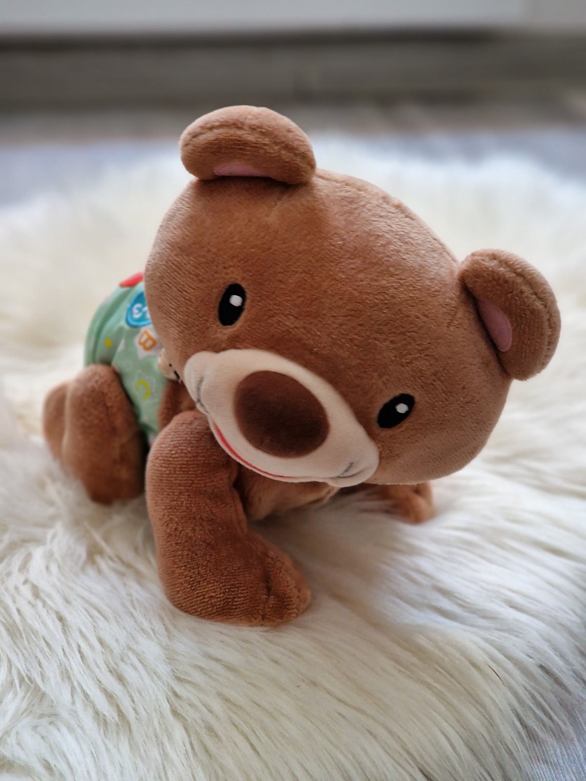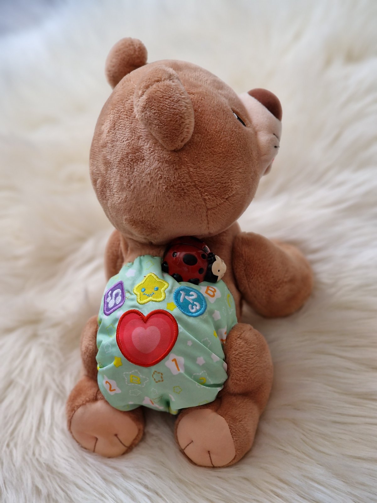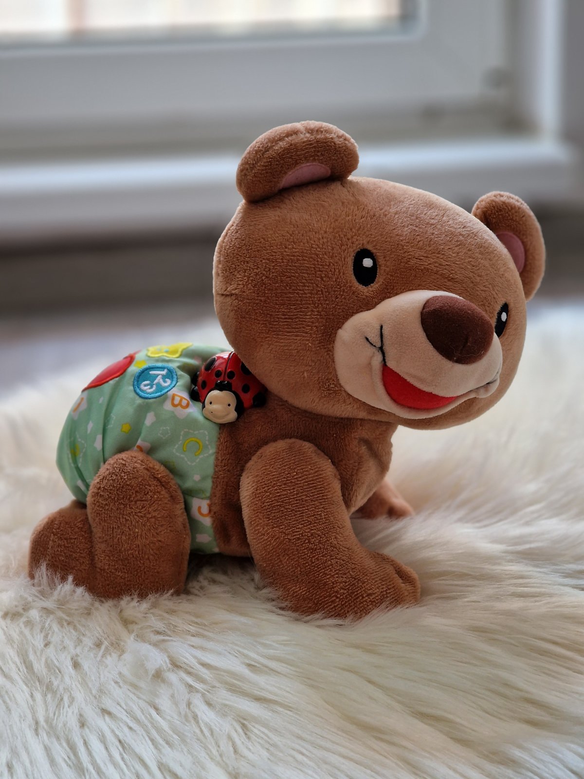 Rozkošný, lezúci medvedík povzbudzuje deti k pohybu a je plný zábavy. Plyšový medvedík má na sebe malú lienku, ktorá po stlačení svieti. Stlačte srdiečko na plienke a sledujte, ako šikovný kamarát začne liezť.