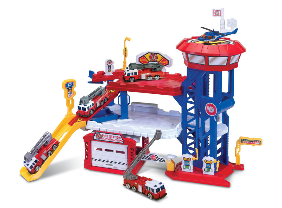Hasičská stanica má 2 podlažia. Obsahuje hasičské auto, vrtuľník, výťah, nájazdy, garáž s vyklápacími bránami, nálepky, obrázkový návod na zloženie stanice.