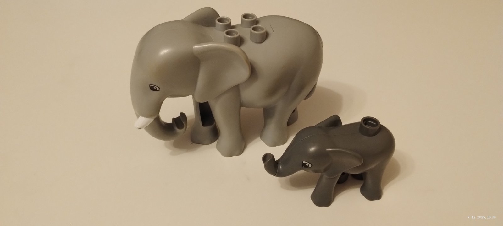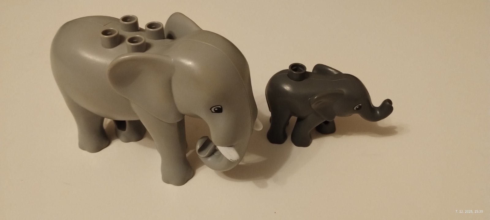 Lego duplo dospelý slon s mláďaťom, veľký slon má známky používania, je miestami zažltnutý, na bledošedej farbe sa to stáva a na kloch je oškretá biela farba, mľáda je bez poškodení.