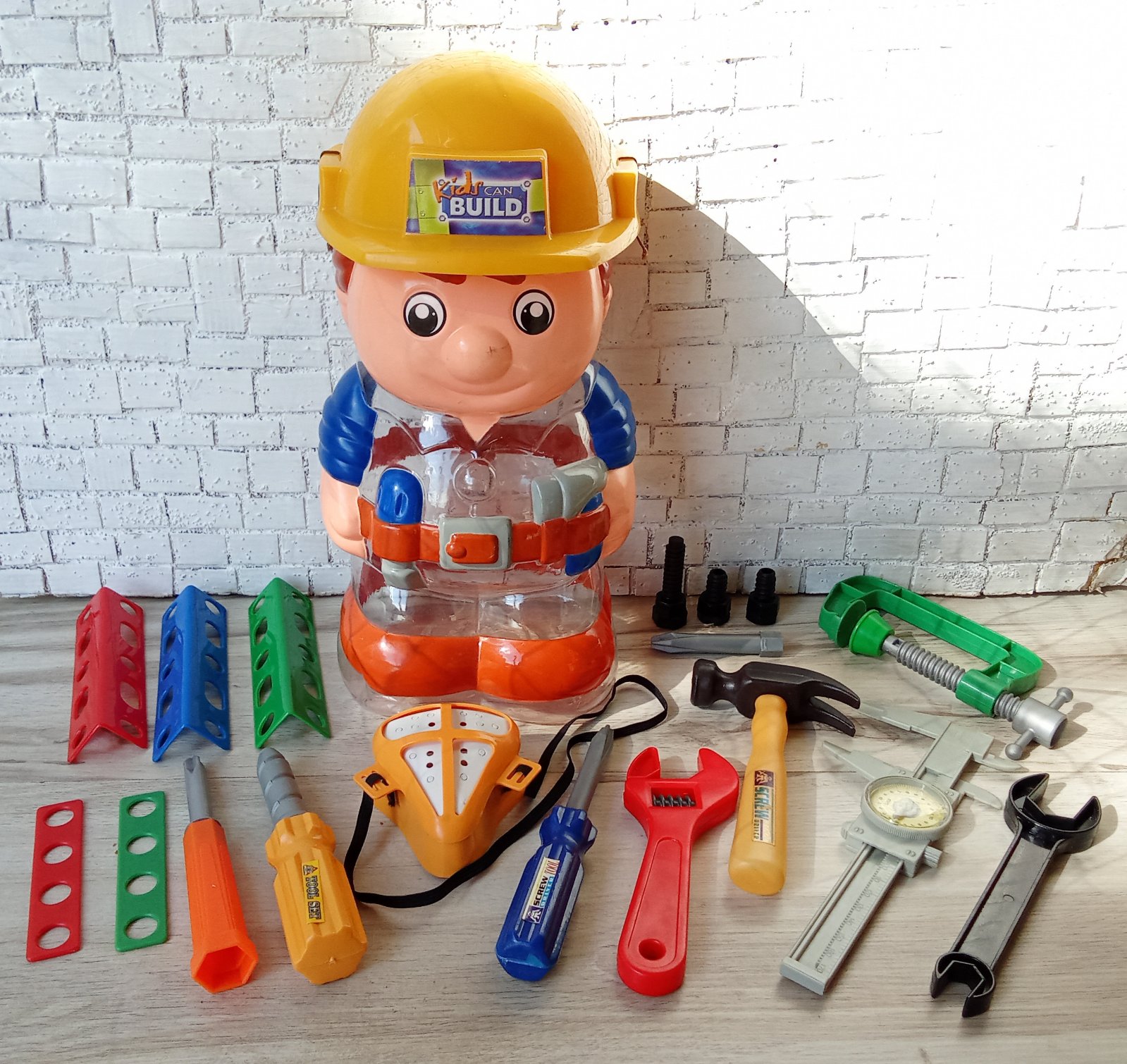 Predám 20 dielnu súpravu náradia pre malých majstrov v tvare - v ukladacom priehľadnom boxe v tvare postavy majstra.