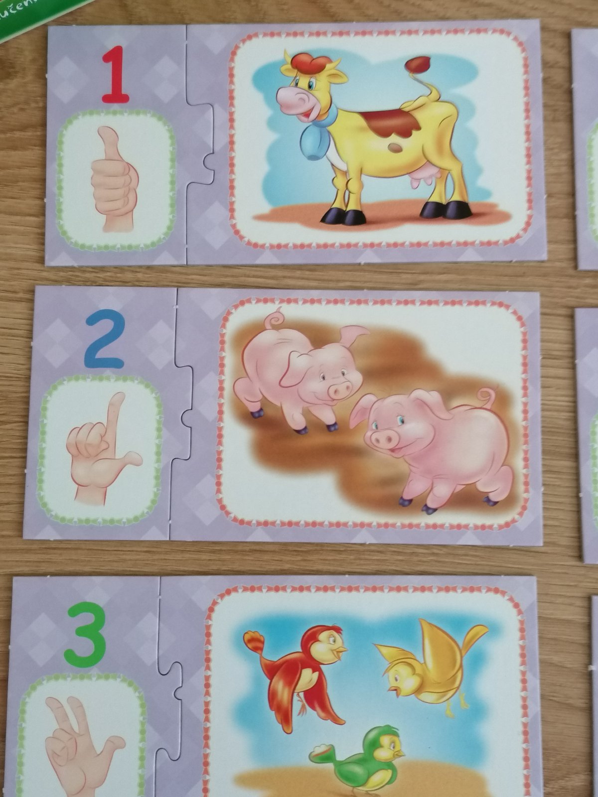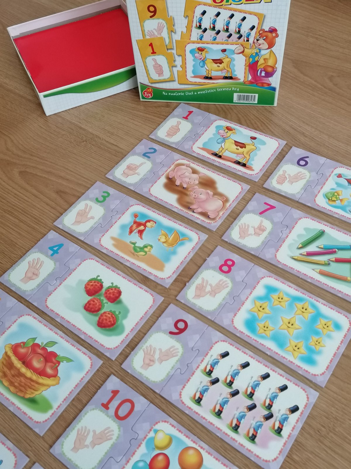 👍 Dieťa oddelí 24 kartičiek, ktoré tvoria 12 obrázkov s číslami a množstvom, premieša ich a položí pred seba stôl. Hravou formou priraďuje k sebe a poskladá pôvodný obrázok