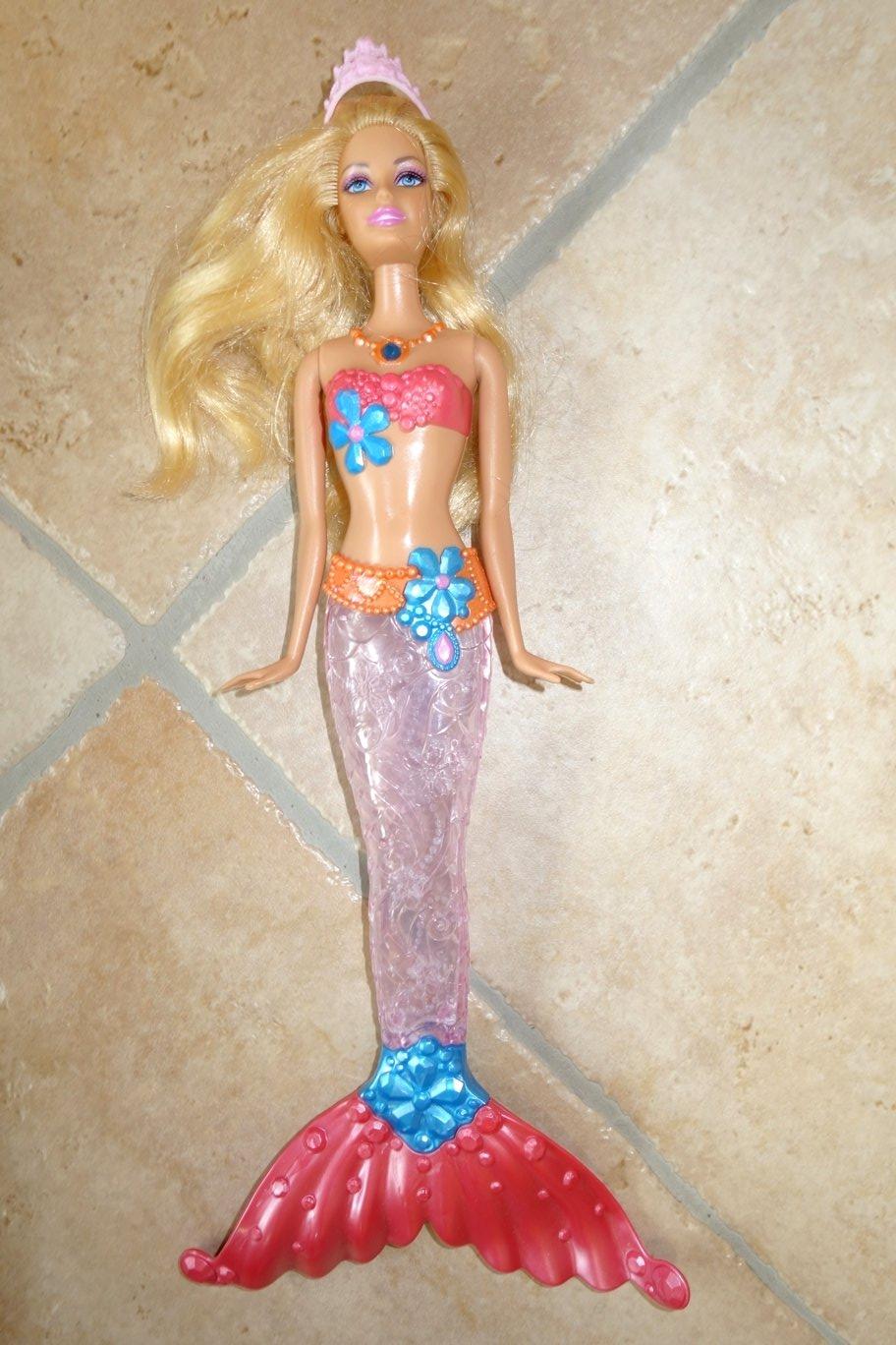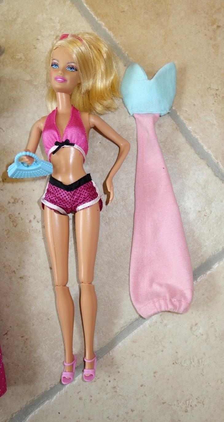 Plážová - v kraťasoch + doma vyrobený návlek morskej panny, má na chrbte mechanizmus, po stlačení dvíha ruky; ohybné kolená, na lícach dve ružové bodky od fixy - 3 €