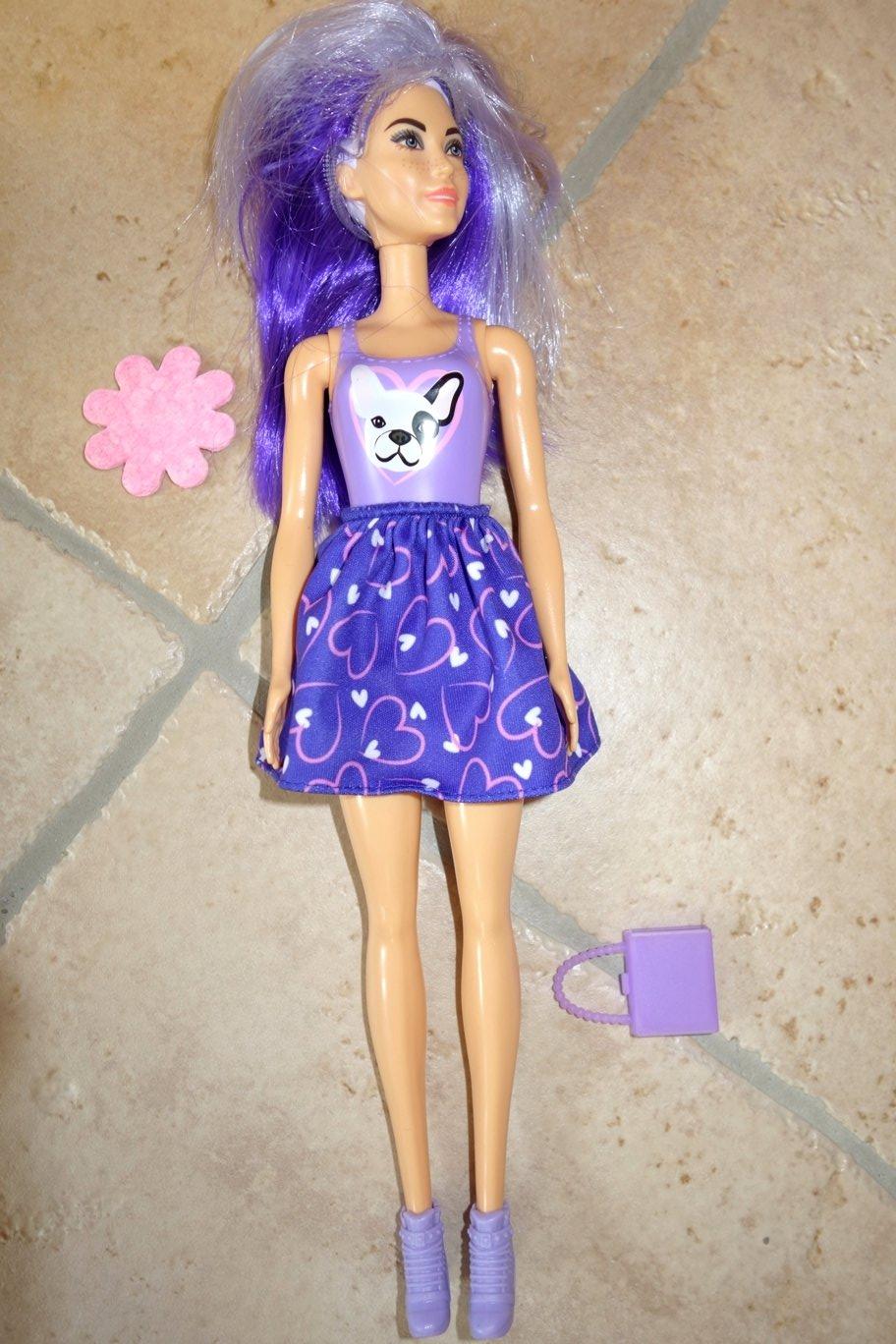 Fialová - Color reveal, bez vady, hýbe ramená, panva, parochňa sa dá dať dole, pod ňou má nakreslený krátky účes, zmenou teploty vody mení účes farbu, aj pery - 4€