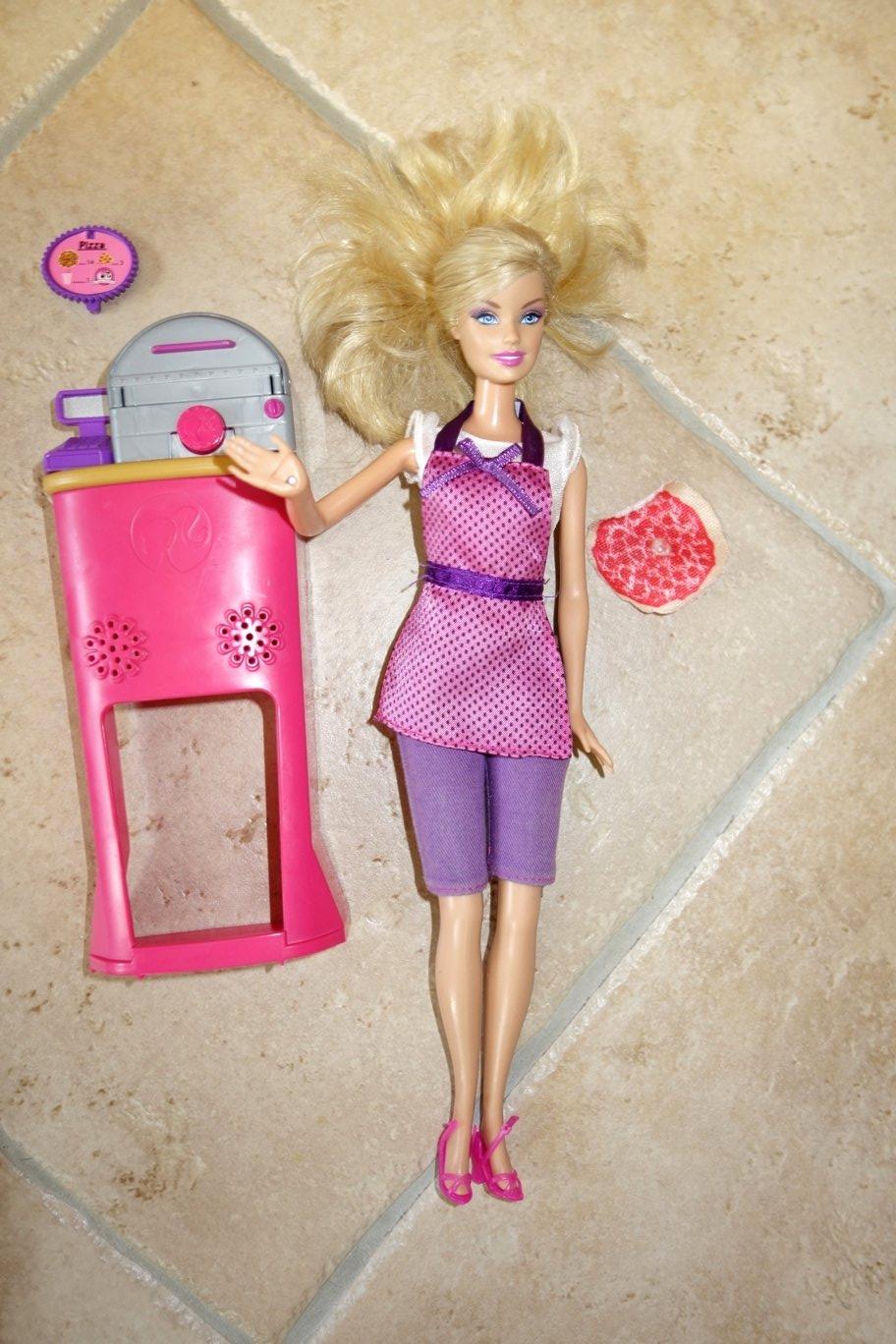 pizza Barbie - ohybné aj kolená, na ruke mala látkovú pizzu, je tam vo výbave, ale ulomená, neviem či sa dá prilepiť ; na chrbte mechanizmus, po stlačení hýbe rukou+ pizza trúba, ktorá jej patrila - spolu 5€