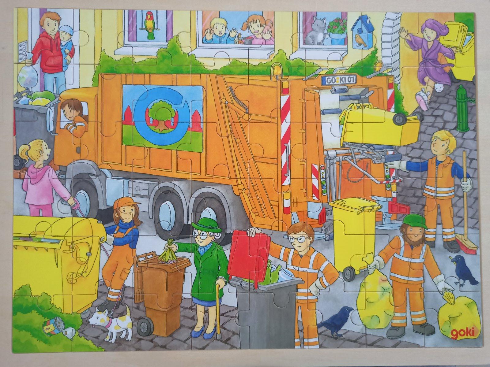 Drevené puzzle smetiari, v ráme, 48dielikov.