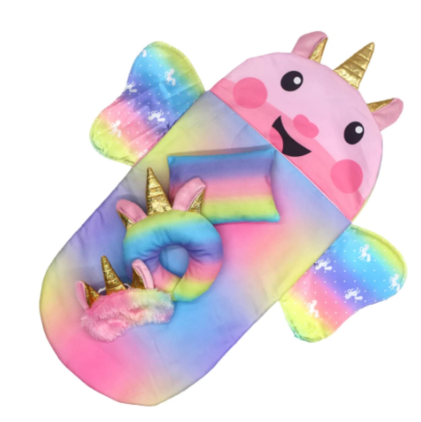 Dúhový spací vak Jednorožec pre bábiku, set 4 ks obsahuje spací vak, vankúš, maska na oči, poduška, vhodné pre bábku veľkosti do 43 cm, materiál látka, dá sa prať v práčke na šetrnom praní.