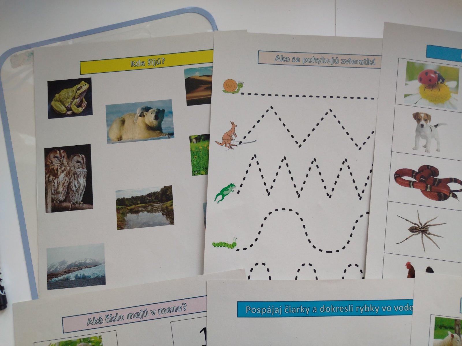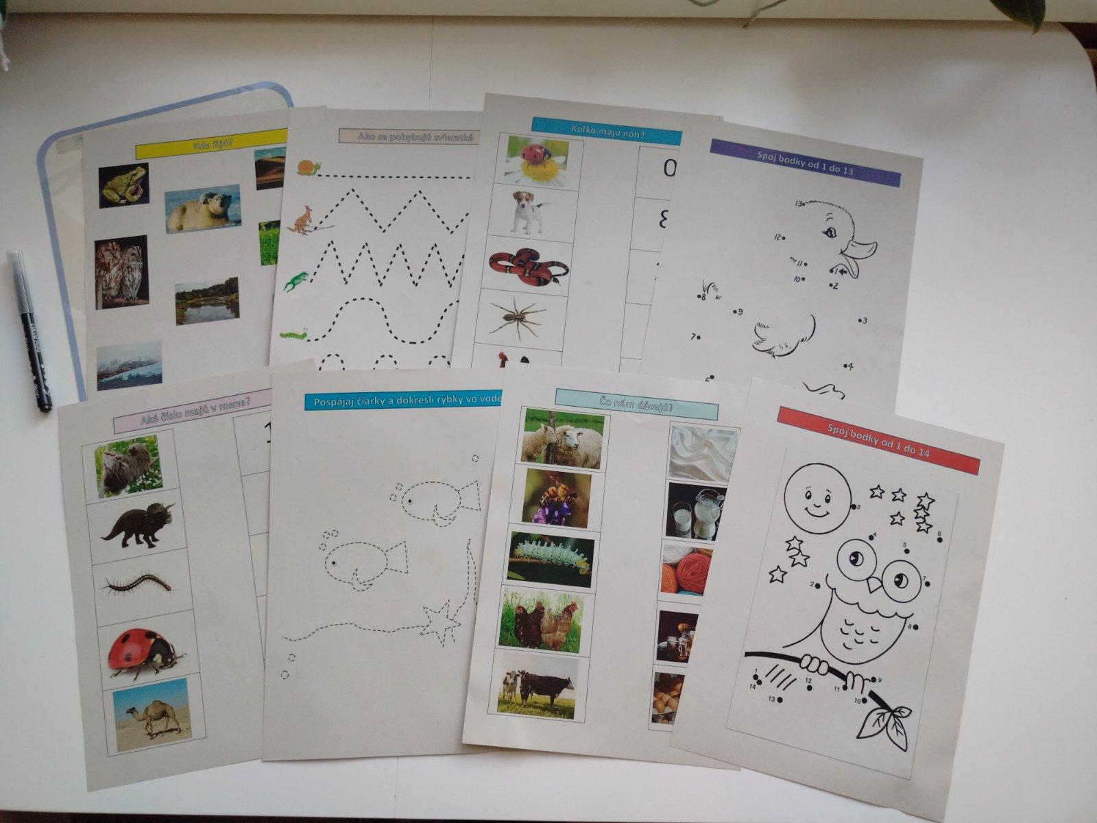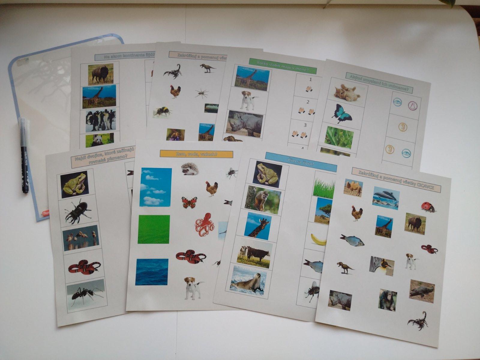 8 x A4 veľkosť obojstranných rôznych aktivít, čiže 16 rôznych aktivít, úloh na tému zvieratá v stierateľnom obale, nieje nutné nič laminovať, obal je možné použiť opakovane aj s inými úlohami.