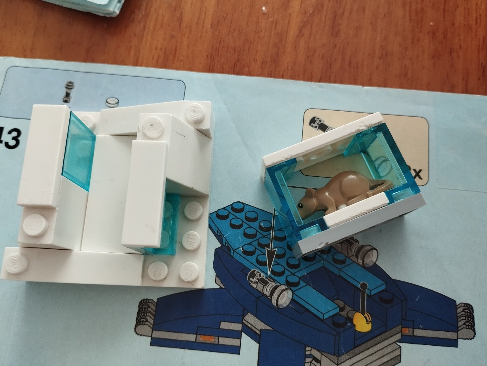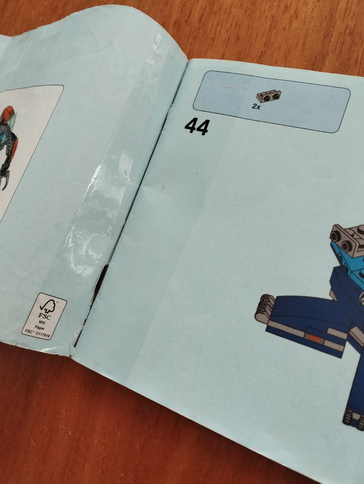 Hraný stav, bez krabice, návod je polepený, veľa krát postavené, niektoré lego kocky sú jemné otlacene, viď foto, drapak už samostatne nedrží, dve biele kocky sú nahradené podobnými, viď foto. Ostatné komplet.