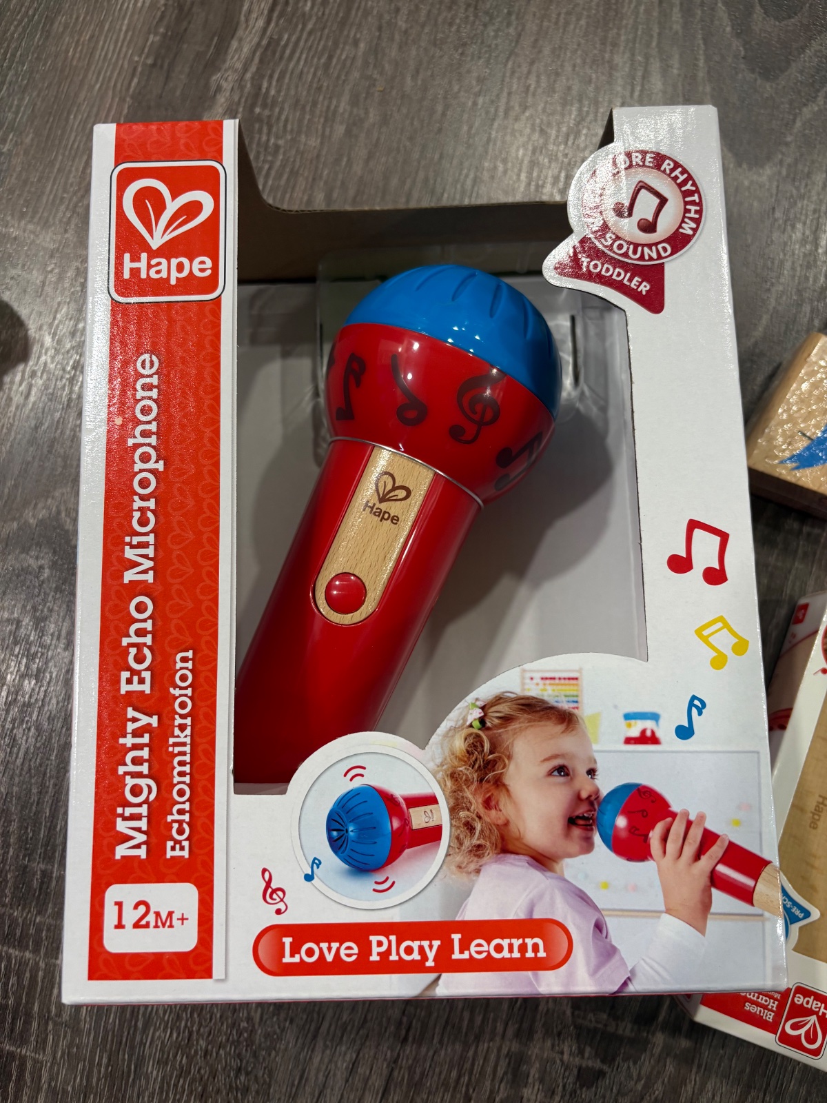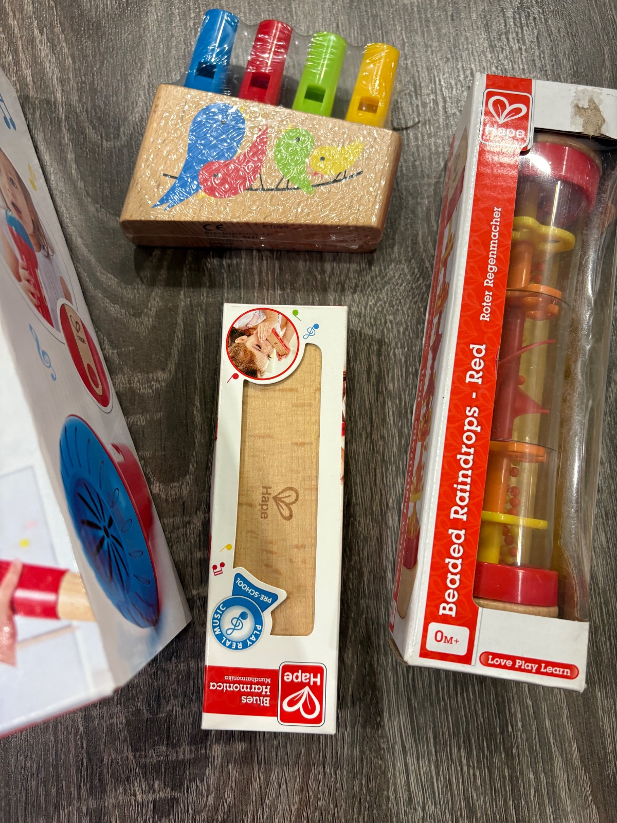 Hape - hudobne hracky pre najmensie deticky….super aj ako darcek,mikrofon,daždova palica,pistalky a harmonika