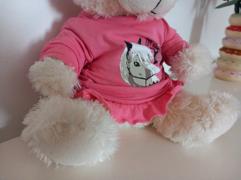 Starší, kedysi aj praný, mäkučký, výška v sede cca 28 cm, farba smotanová, zn. Hračky s úsměvem. Medvedík bol nehraný, len si roky ako dekorácia sedel na polici. Posúvame aj s oblečenými šatami. Treba si ho znova oprať.
