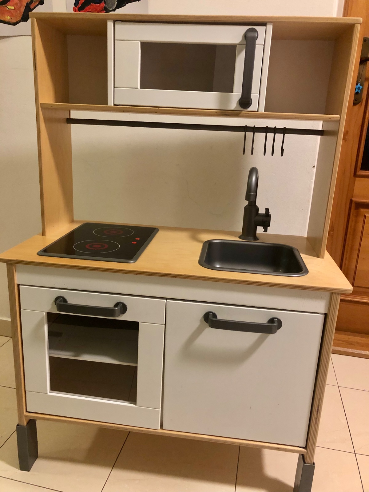 Predám používanú, hranú detskú kuchynku z Ikea (kupovaná nová), bežné známky používania, jemné škrabančeky, minimálne kozmetické “vady”,jemne odšiepenie pri jednej z horných dier na skrutku( vid posl. foto), plne funkčná. Kuchynka je už v rozložením stave.