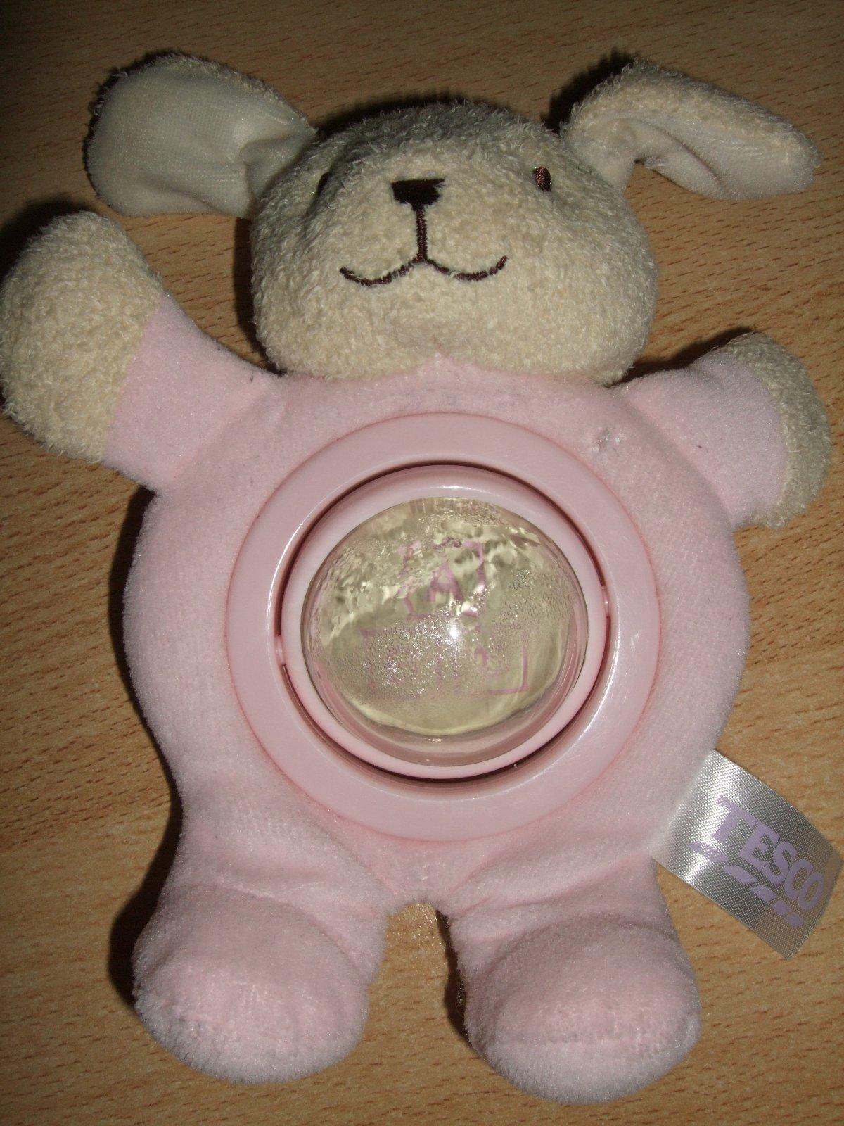 Plyšový zajačik s otočnou plastovou guľou v brušku - z jednej strany hrkálka,z druhej písmenká ABC.