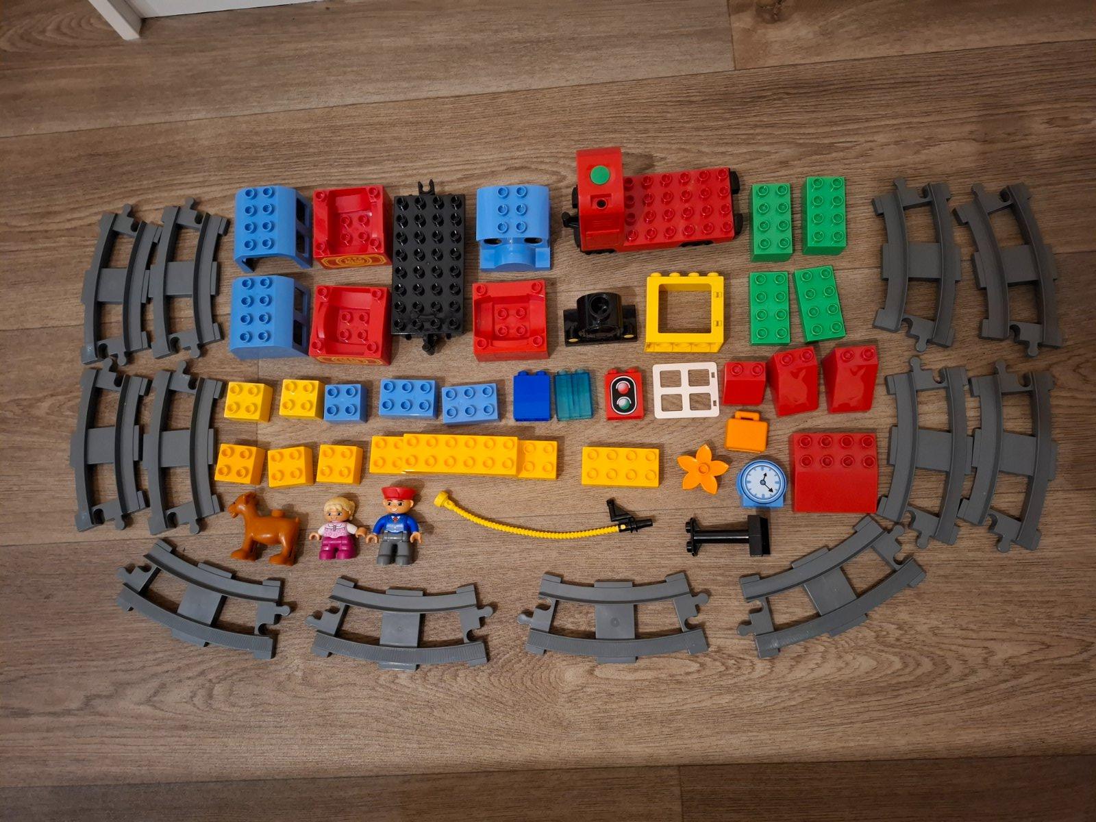 Duplo "moj prvy vlacik" , komplet balenie, stav: hrany, ale masinka funguje, hoci hore kopcom s nalozenymi viacerymi vagonikmi sa jej velmi nechcelo, po rovinke isla bez problemov. V baleni nie je navod, vlacik je bez bateriek. V dalsich inzeratoch mam aj kolajnice.