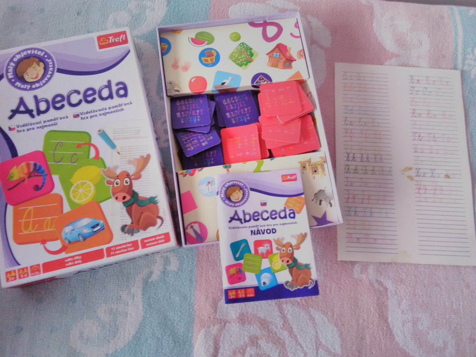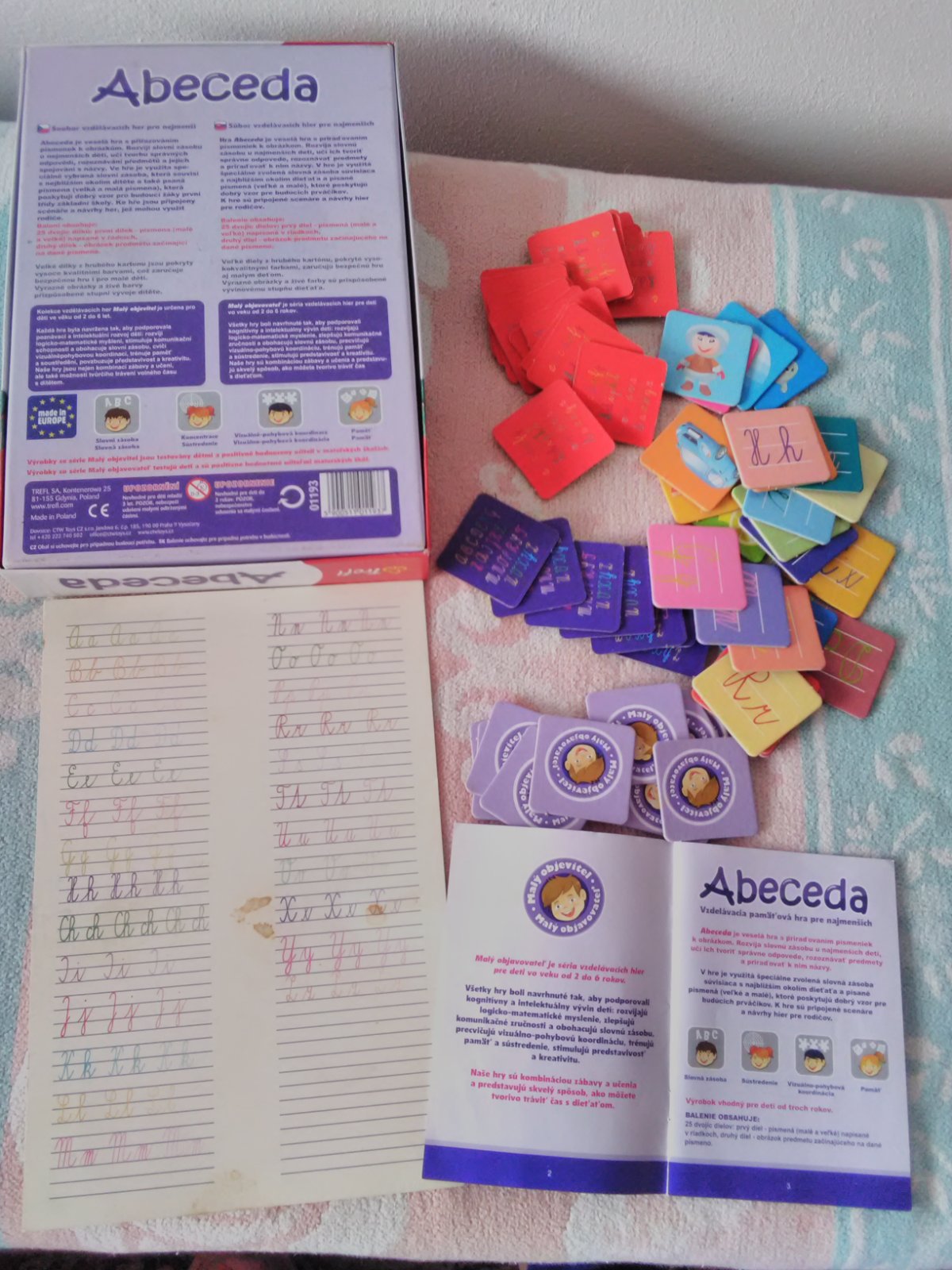Kompletná hra pre deti na spoznávanie pismeniek abecedy, obsahuje návod, všetky kartičky s písmenami a obrázkami, A4 vykres predloha s písanymi písmenami abecedy na jednej strane trochu pospinene viď foto, V návode je 11 navrhov hier.