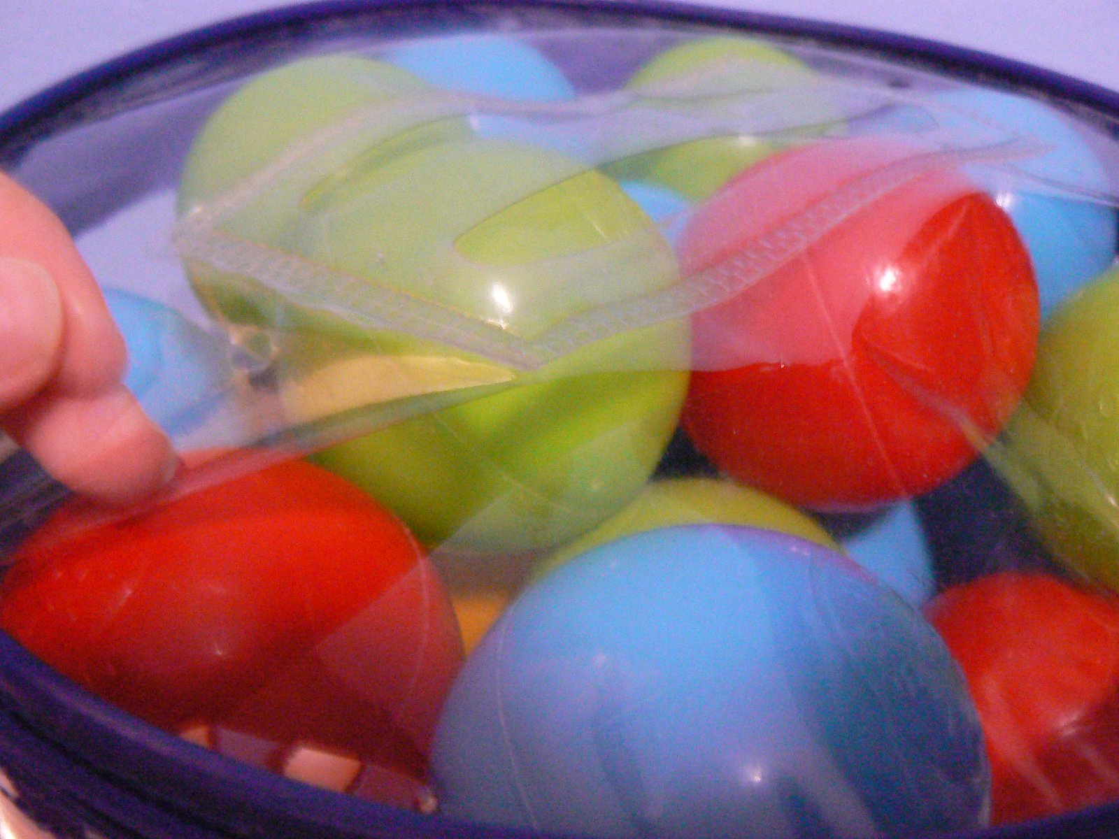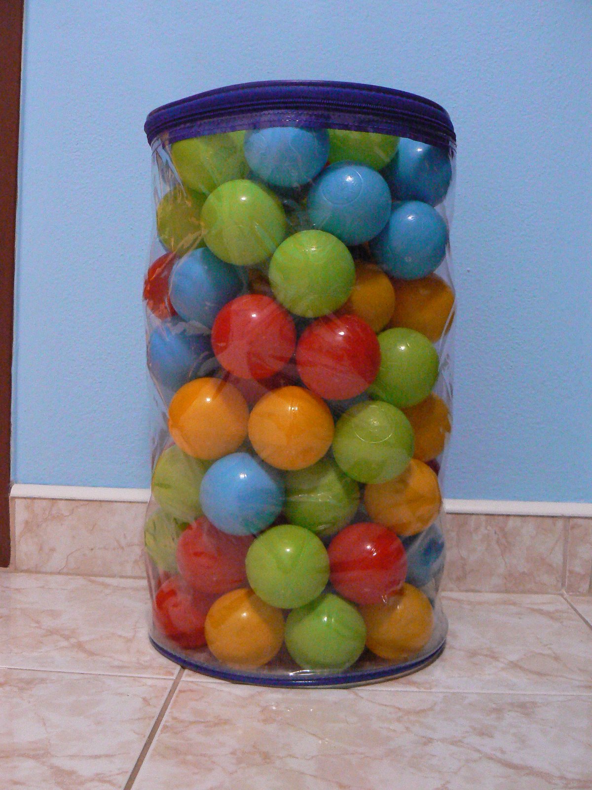 Plastové loptičky 96ks priemer cca 6cm, obal má v hornej časti uško a je mierne natrhnutý. Niektoré loptičky mierne preliačené.