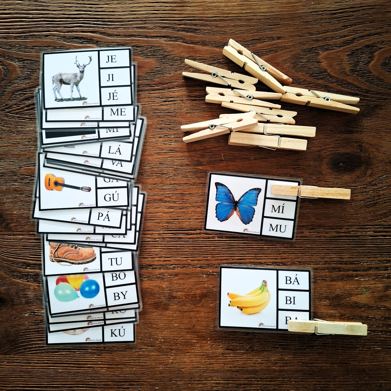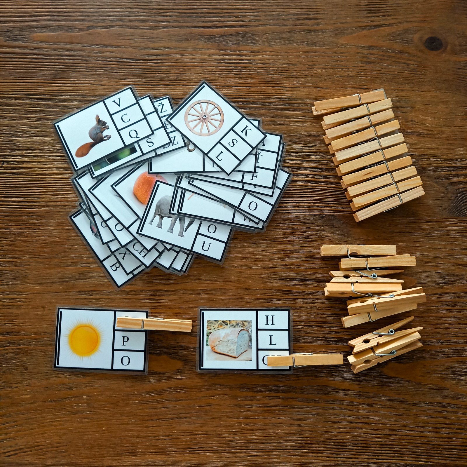 Mám tri sady, jedna na určovanie prvej hlásky slova a druhá na určovanie poslednej hlásky slova, tretia na určovanie prvej slabiky slova. V jednej sade je 32 zalaminovaných kartičiek s rozmerom 9x6 cm. V prípade záujmu môže byť na druhej strane kontrola správnosti. Štipce nie sú súčasťou balenia (ale v prípade záujmu ich viem priložiť).