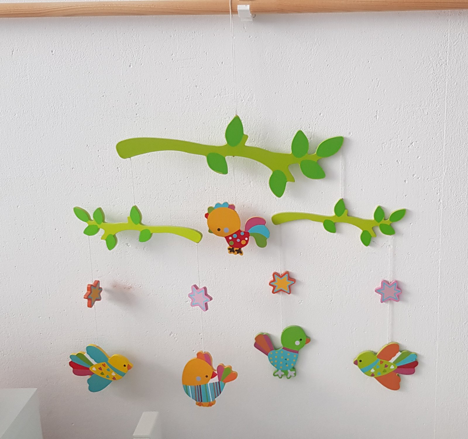 Závesná dekorácia nad postieľku, prípadne inde v rámci detskej izby. Veľmi pekná práca, sýte farby. Pohybuje sa voľne v priestore vďaka upevneniu na šnúrkach.