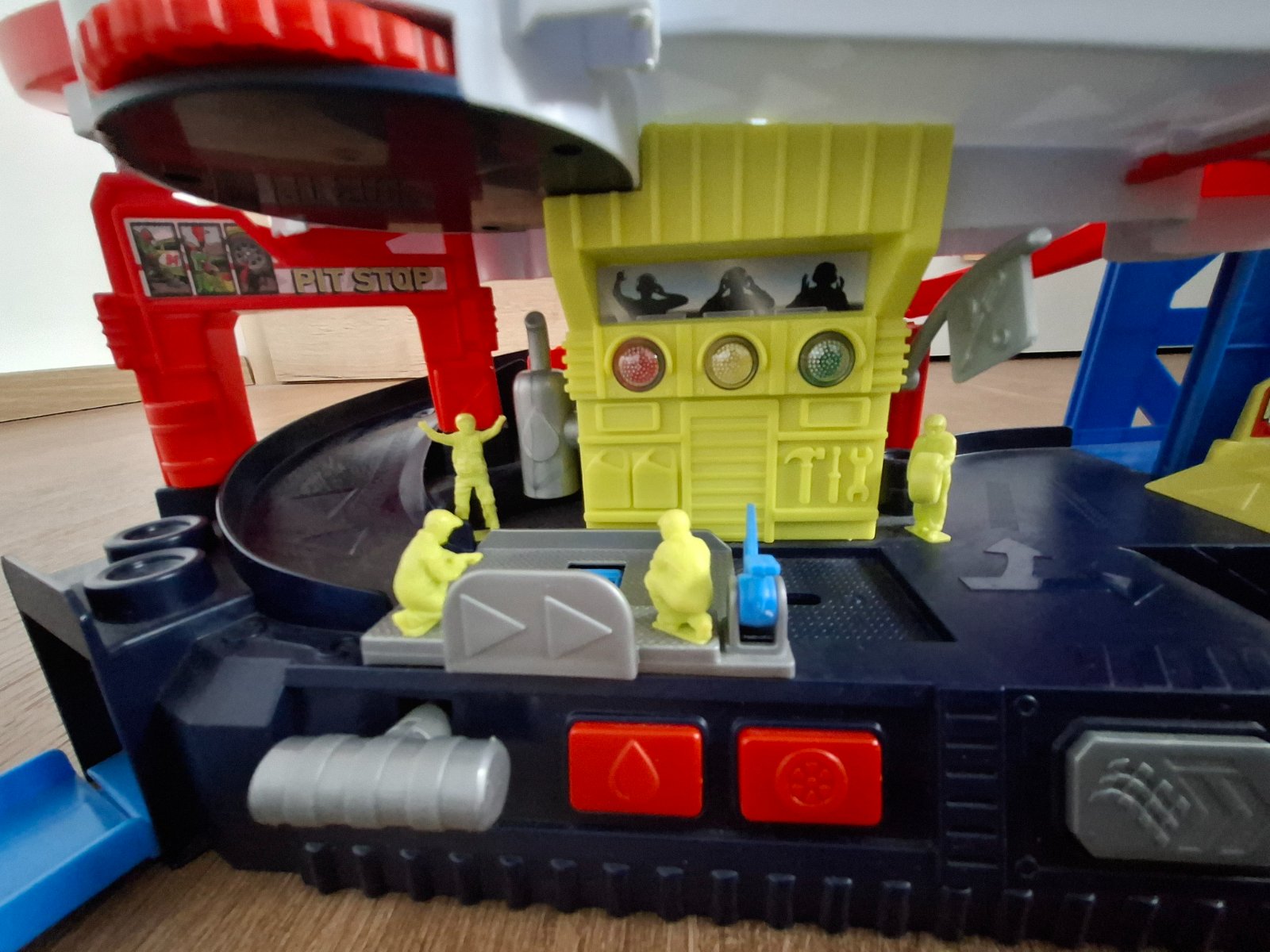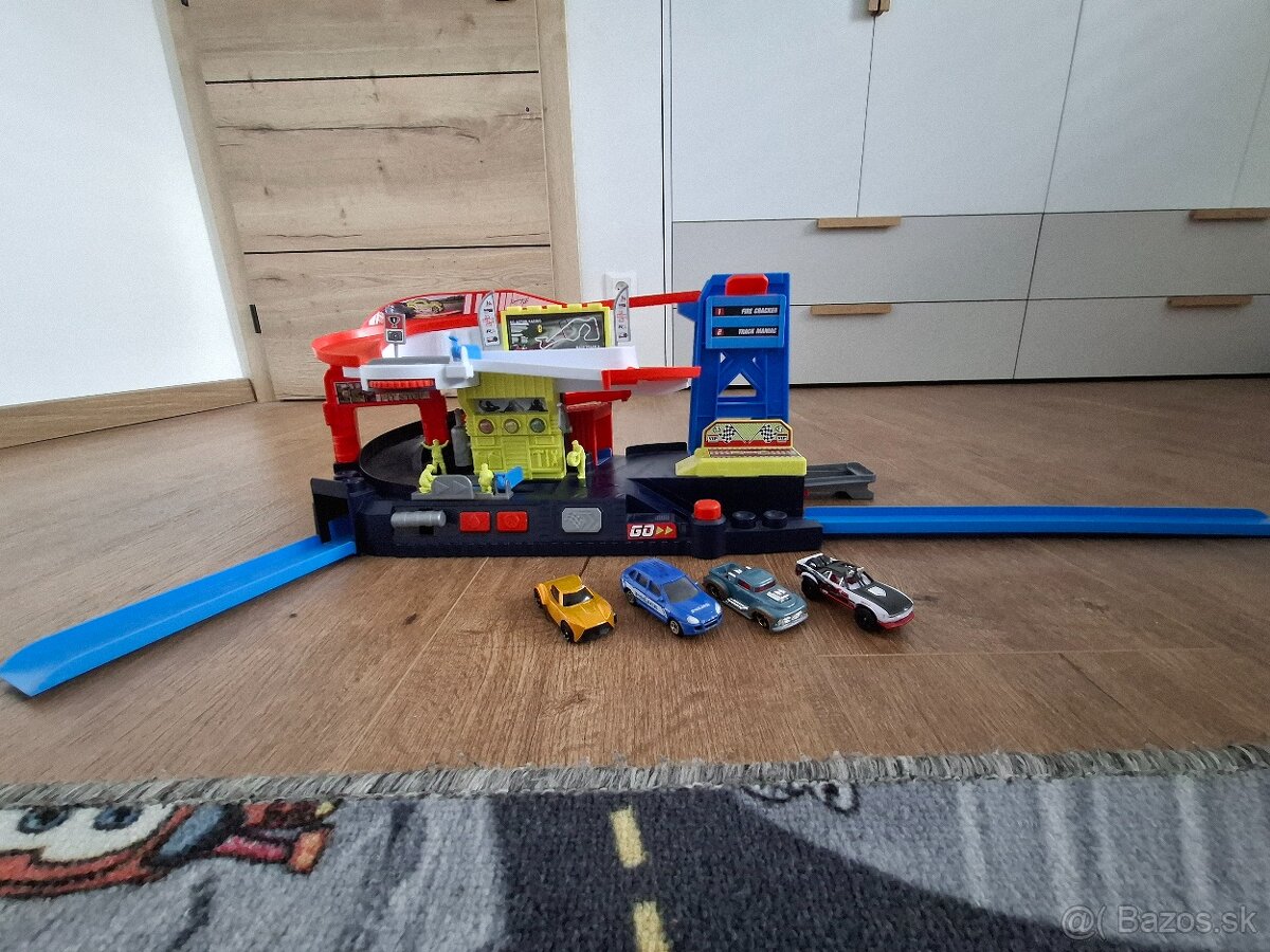 Malo hrane, bez poškodenia. Zvukove, svetelné efekty. Zvuk prezuvanie kolies, voda, odstartovanie auta. Pohyblivé časti. Vpravo výťah hore - dole. Vľavo hore koliesko sa točí. Vpravo dole odstrelovacie tlačidlo.... možnosť doviesť na trase Mt - DK.