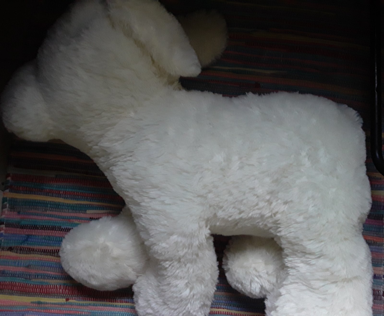 na baterky, krúti hlavou a šteká, plyšové, hnedo-biele šteňa s taštičkou, veľké 15 cm, vysoké 17 cm