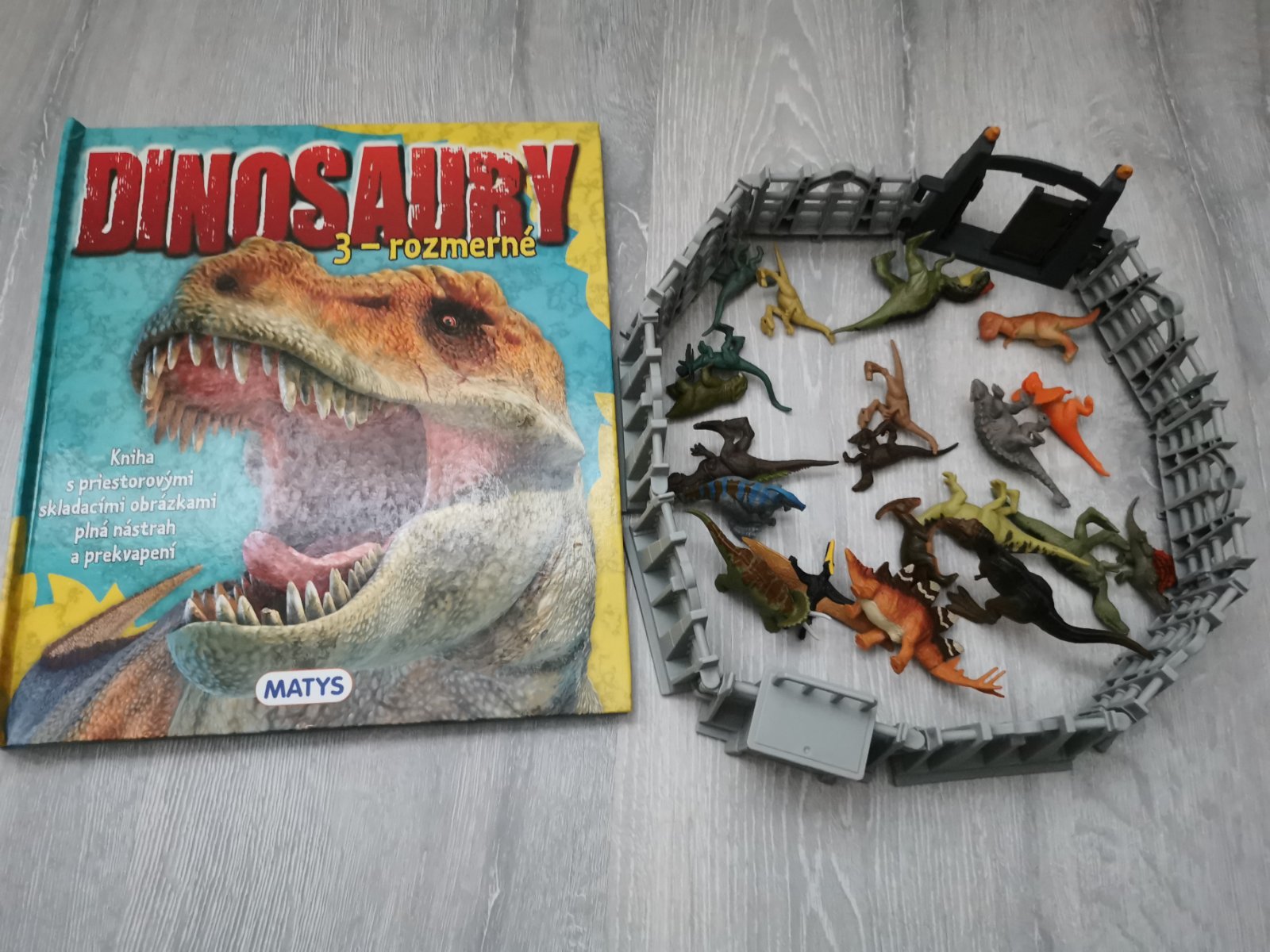 Citana kniha s 3d trojrozmernymi obrazmi dinosaurov a 20 kusov postaviciek dinosaurov s ohradou. Cena vsetko spolu