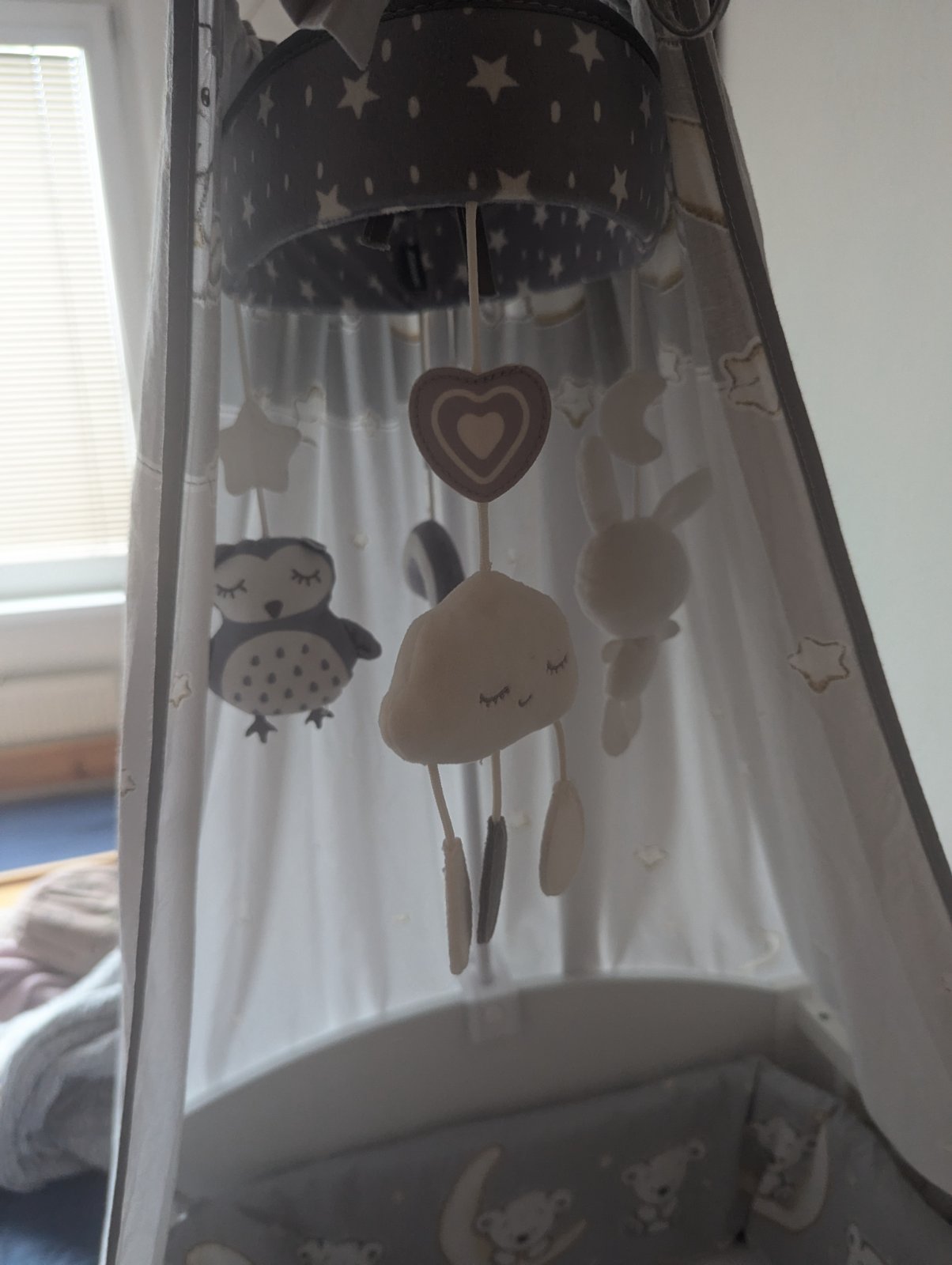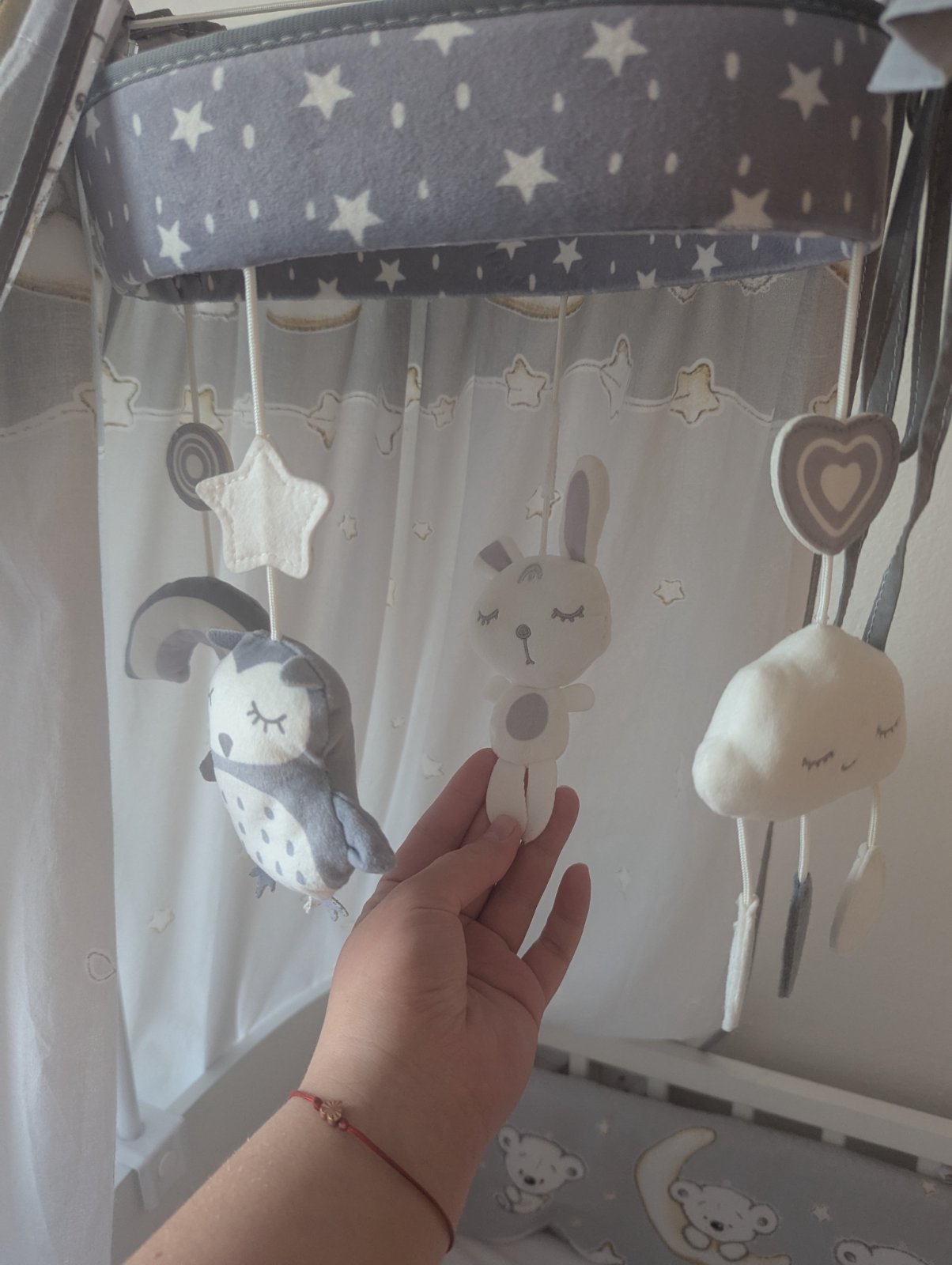 Detský kolotoč nad postieľku, je vo výbornom stave ako nový, bez poškodenia. Kolotoč je len vysiaci, niektoré hračky "šuštia" a niektoré "pískajú".