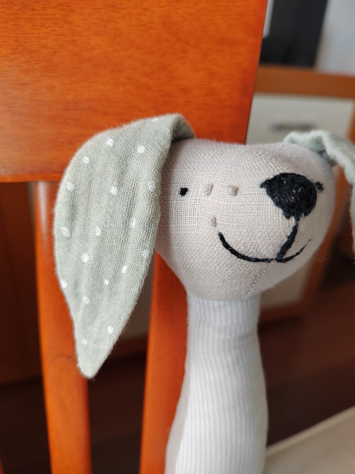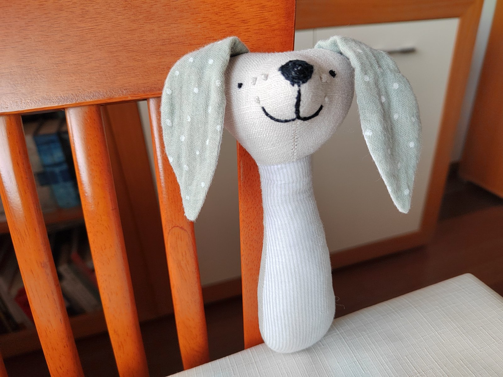 Zdobia ju dlhé ušká, ktoré určite zaujmú malého človiečika a vyšívaná usmiata tvárička. Vnútri sa nachádza roľnička, ktorá vydáva jemný cinkotavý zvuk.
